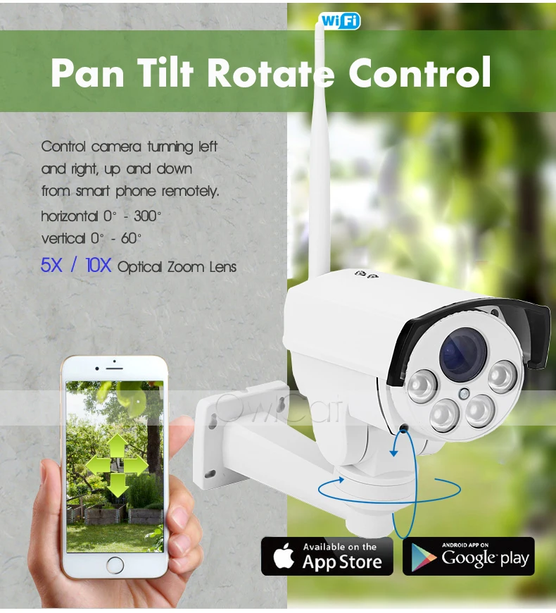 Поддержка наклона панорамирования с помощью смартфона/ПК через Интернет в любое время в любом месте, поворот наклона панорамирования. Горизонтальная: 300 ° и вертикальная: 60 °.
