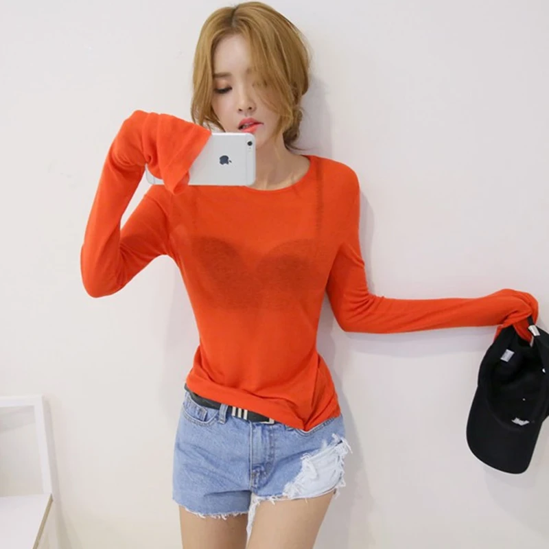 Футболка женская Просвечивающая однотонная, базовая прозрачная хлопковая эластичная с длинным рукавом, топ в Корейском стиле