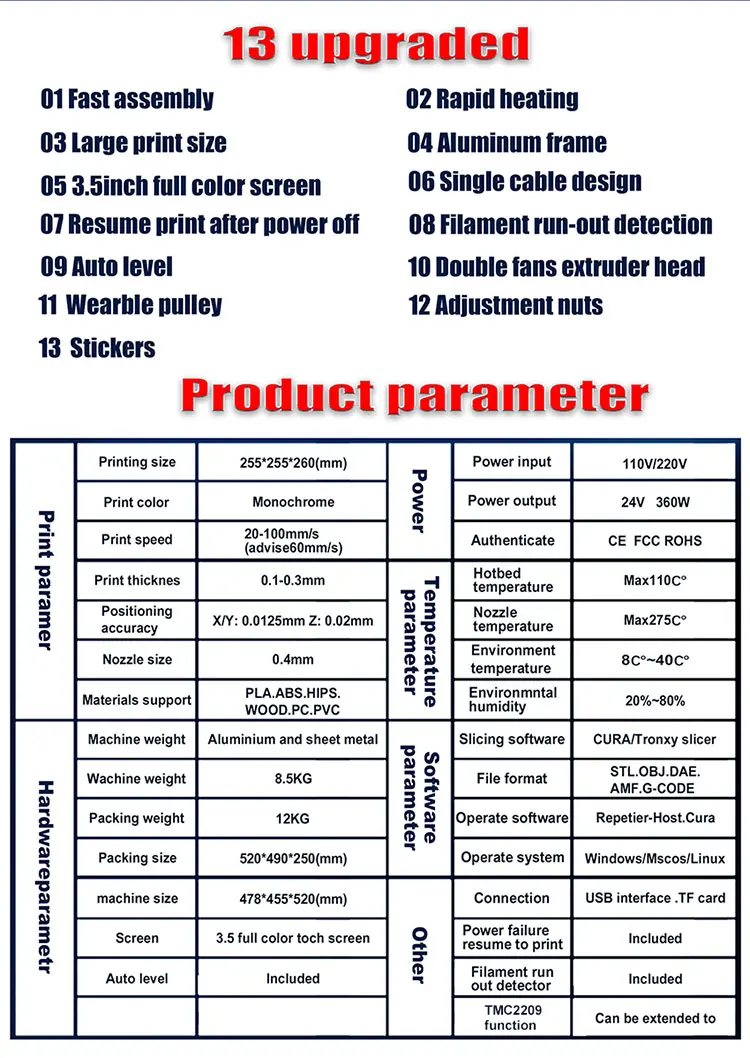 Размер печати: 255*255*260 мм (XY-2 PRO titan Размер печати: 255*255*245 мм)Поддержка материалов: PLA.ABS.HIPS.WOOD.PC.PVC (XY-2 PRO titan также поддержка: TPU)Дисплей: 3,5 дюймов Полноцветный сенсорный экранМатериалы машины: алюминий и листовой металл