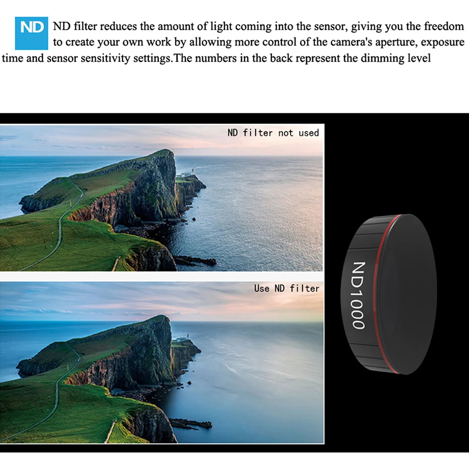 ND-фильтр уменьшает количество света, поступающего в датчик, давая вам свободу создавать свою собственную работу, позволяя больше контролировать диафрагму камеры, время экспозиции и настройки чувствительности датчика. Количество в задней части обозначает уровень затемнения.