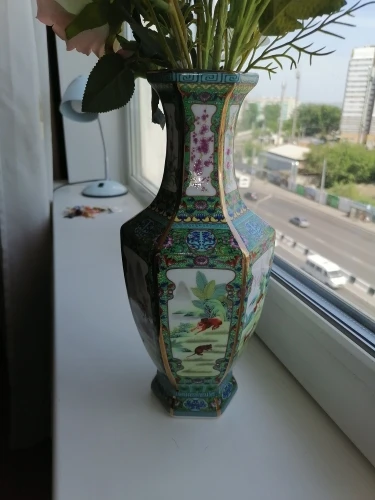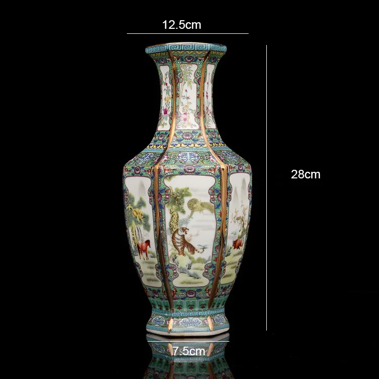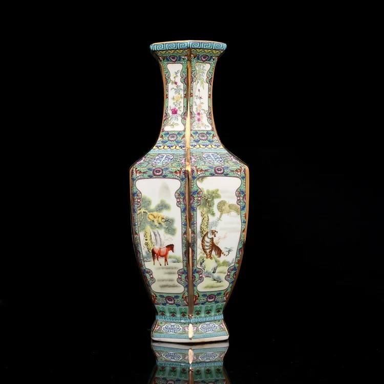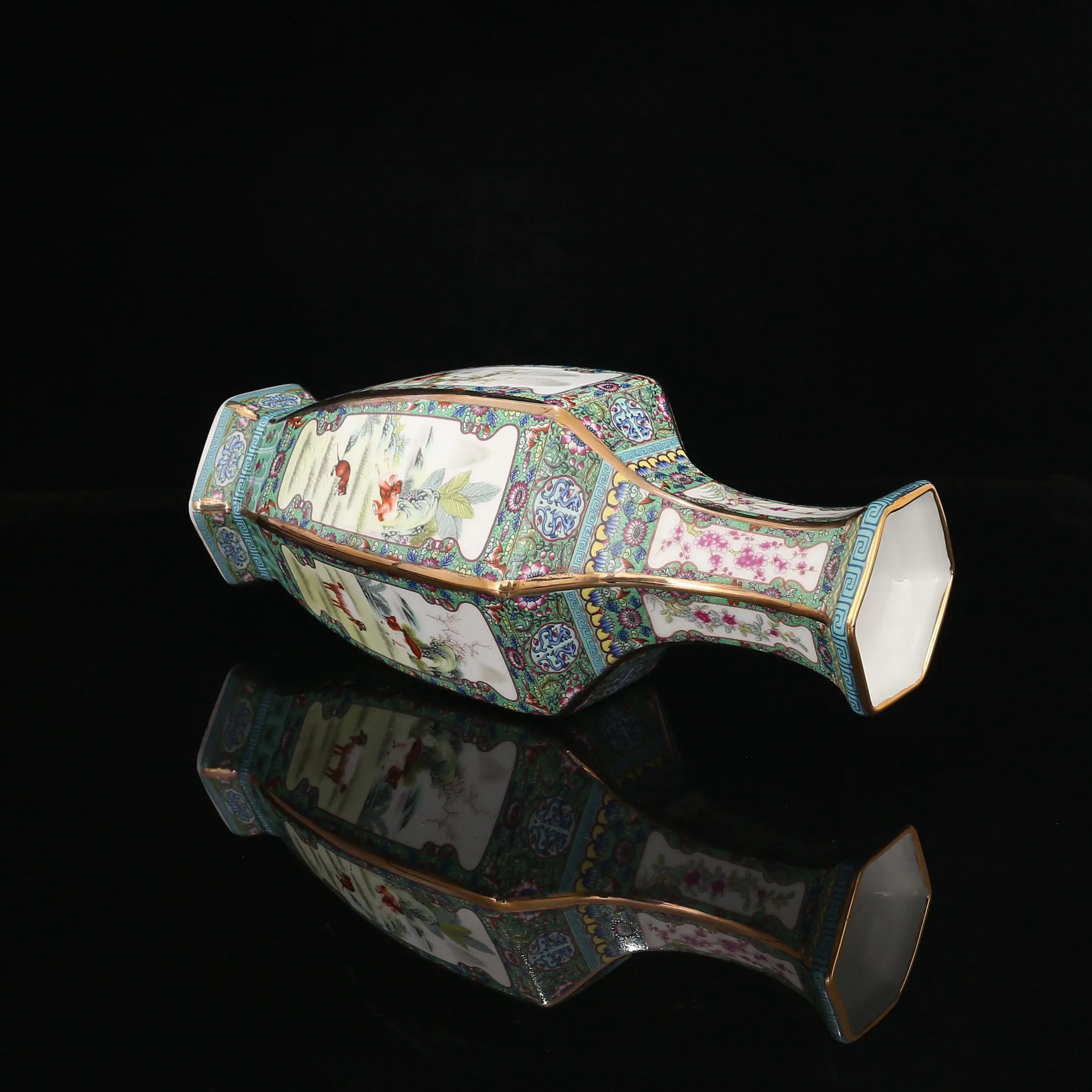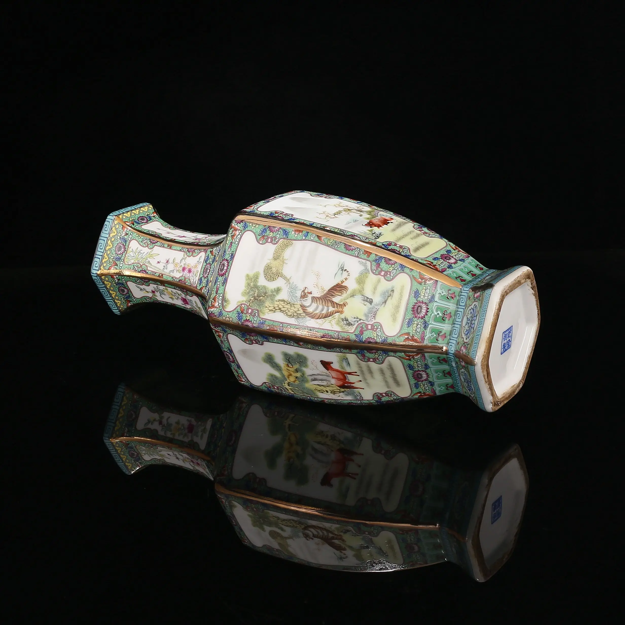 Эмалированная керамическая ваза, картина в Qianlong, знак золотого зодиака Шестигранная ваза, коллекция античного фарфора