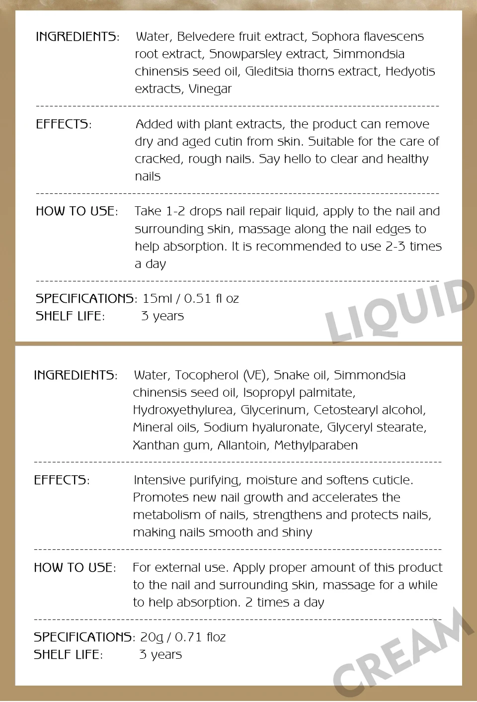 Состав: вода, токоферол (VE), змеиное масло, симмондсия шиненсис семян масло, лсопропил пальмитат, Hydroxyethylurea, глицерин, цетостеариловый спирт, минеральные масла, гиалуронат натрия, глицерил стеарат, ксантановая камедь, аллантоин, метилпарабенЭффекты: интенсивное очищение, увлажнение и смягчение кутикулы. Способствует росту новых ногтей и ускоряет метаболизм ногтей, укрепляет и защищает ногти, делая ногти гладкими и блестящимиСпособ применения: для внешнего использования. Нанесите необходимое количество этого средства на ноготь и окружающую кожу, помассируйте на некоторое время, чтобы помочь абсорбции. 2 раза в деньХарактеристики: 20 г/0,71 унцийСрок годности: 3 года