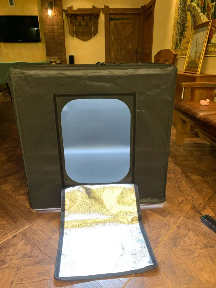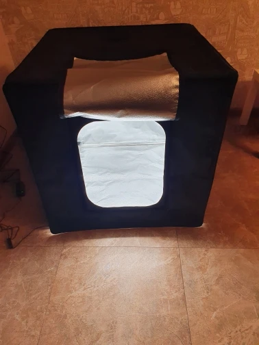 Доставка мгновенная, привет зли на дом. Куб в удобной сумке для переноски. Сборка интуитивная. В описании были показаны 3 осветителя, в комплекте оказалось 2, но свет весьма яркий и его достаточно. Брал 80см, возможно там не предусмотрено варианта с тремя лампами. В комплекте нашёл маленький трипод для закрепления мобильного телефона, приятный бонус. Покупкой в целом доволен, брал для предметной фотограмметрии.