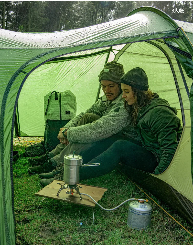 Палатка отличная, и вес очень большой, пространство у нее есть, они подходят для 3 человек очень удобно. Лобби очень большой, почти 2/3 комнаты. Напольный коврик покрывает площадь комнаты и половину лобби, так что вы можете идеально установить влажную часть и сухую часть внутри, отлично подходит для мест с дождем. Готовы проверить его в южной Чили