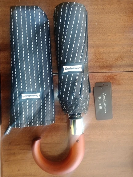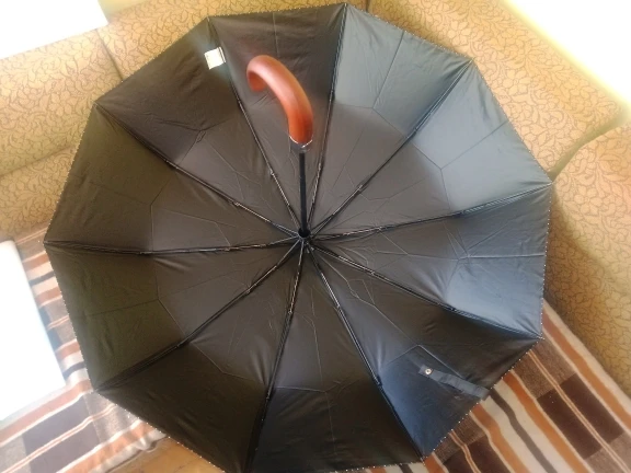 Зонт выглядит великолепно. Его приятно держать в руках. Механизм работает без нареканий. Ручка деревянная. В сильный ветер с ним пока не попадал и о защите от шторма ничего сказать не могу. Доставка быстрая
