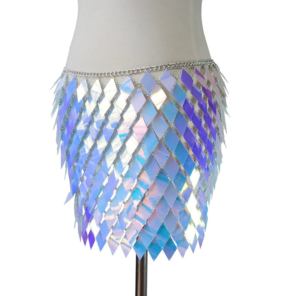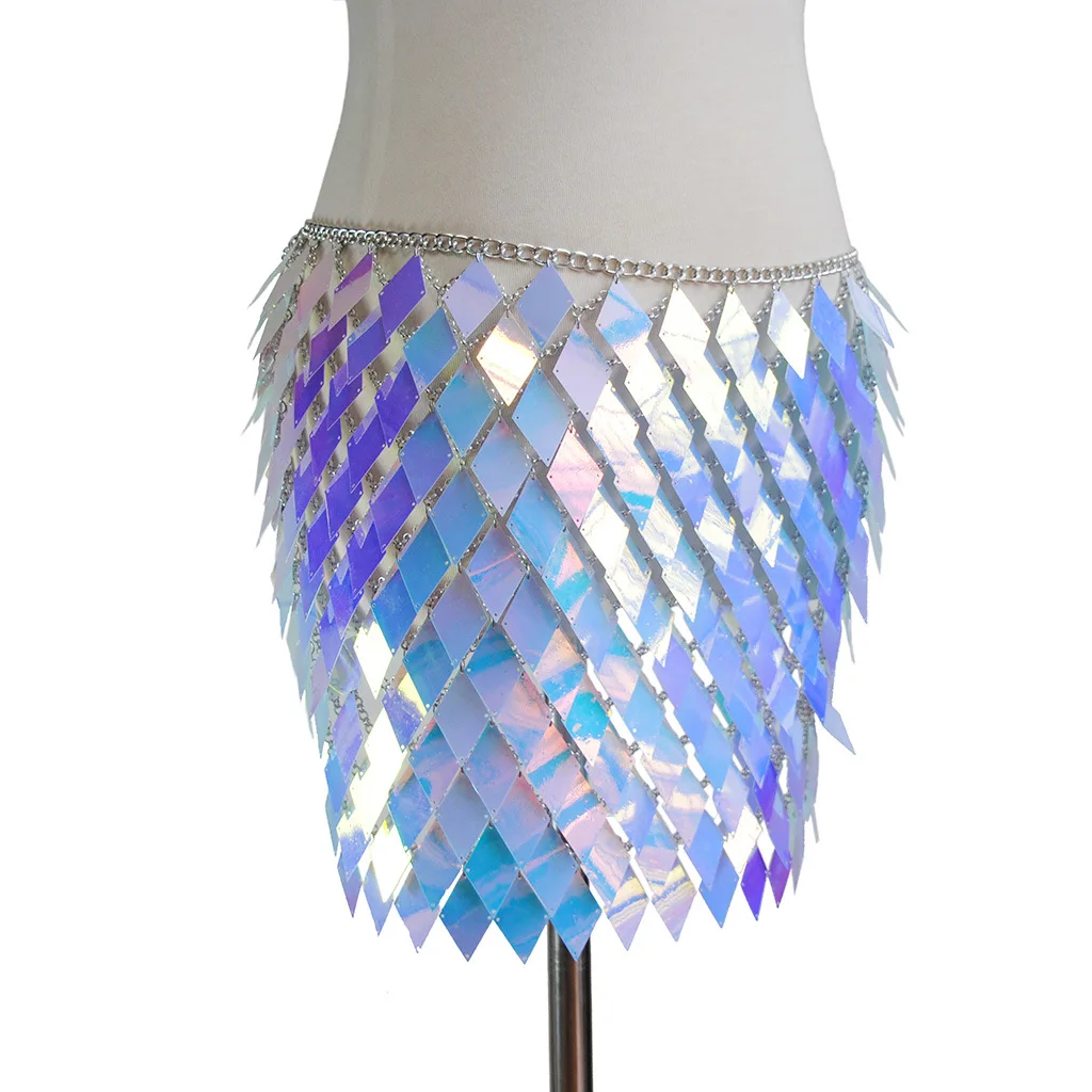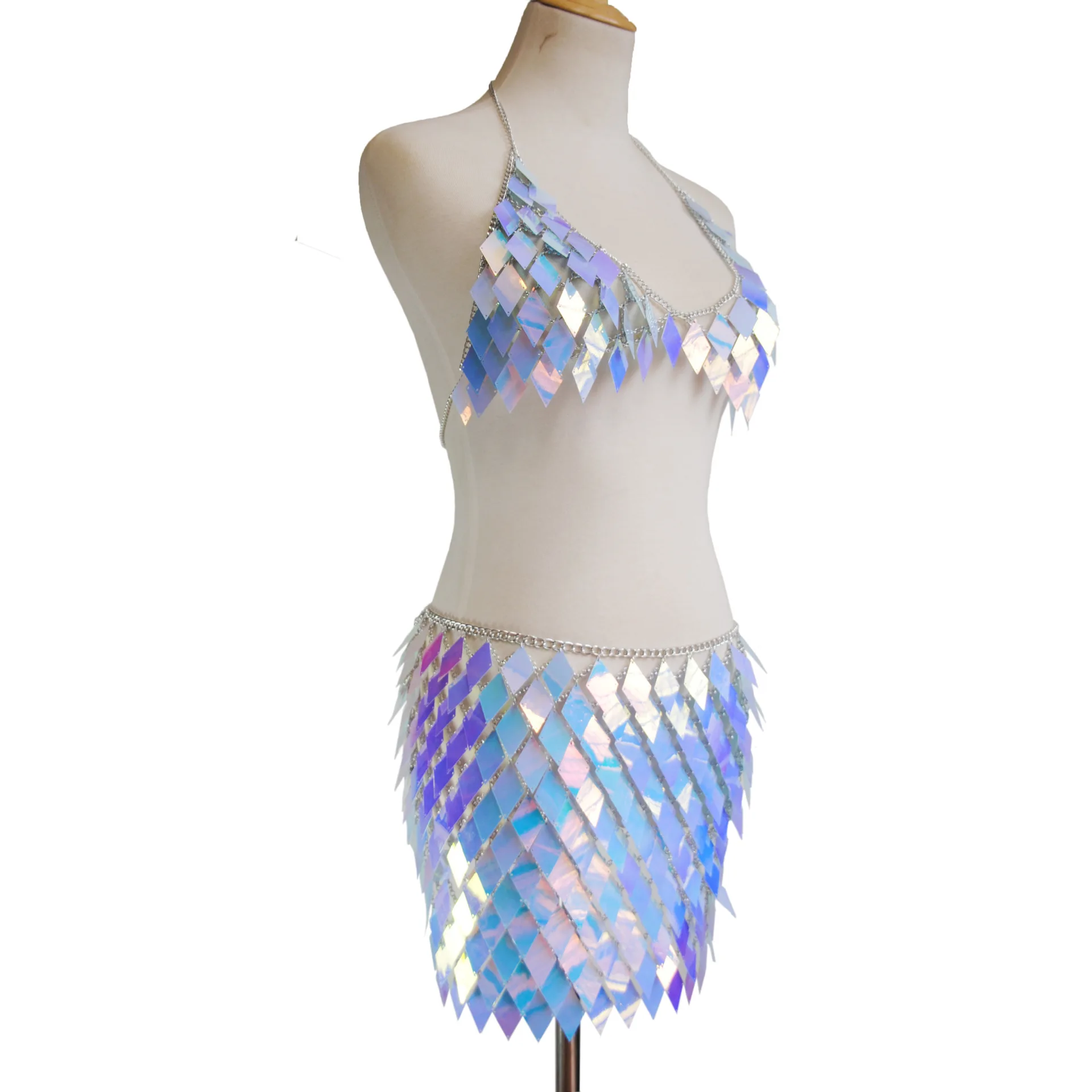 Комплект женский из двух предметов, укороченный топ с блестками и цепочкой, с открытой спиной, с вырезами, мини-юбка, летняя пляжная одежда