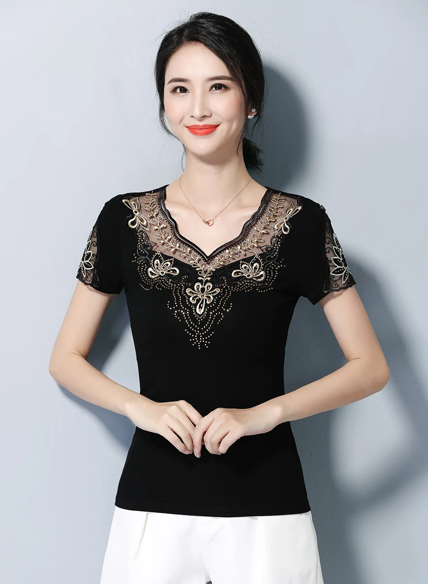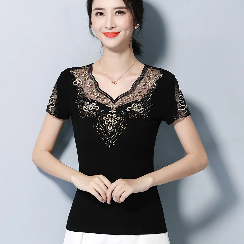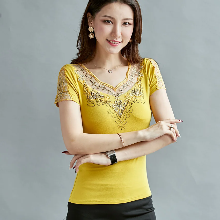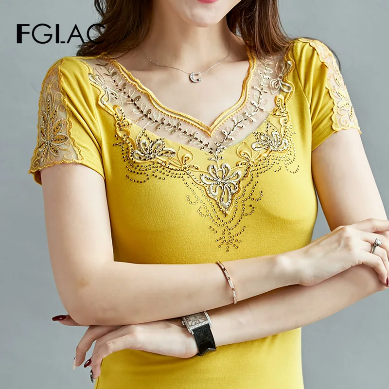 Модная женская футболка, новинка 2021, сетчатые Топы с коротким рукавом, элегантная женская рубашка с вырезами и бриллиантами, блузы