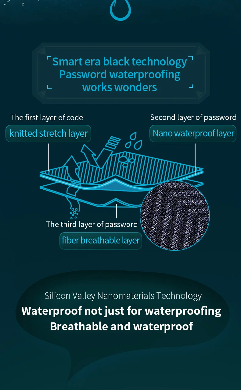 Технология Smart era blackГидроизоляция паролем творит чудесаПервый слой кода: трикотажный эластичный слойВторой слой пароля: Nano водонепроницаемый слойТретий слой пароля: дышащий слой из волокнаТехнология наноматериалов Силиконовой долиныВодонепроницаемый не только для водонепроницаемого ingДышащий и водонепроницаемый