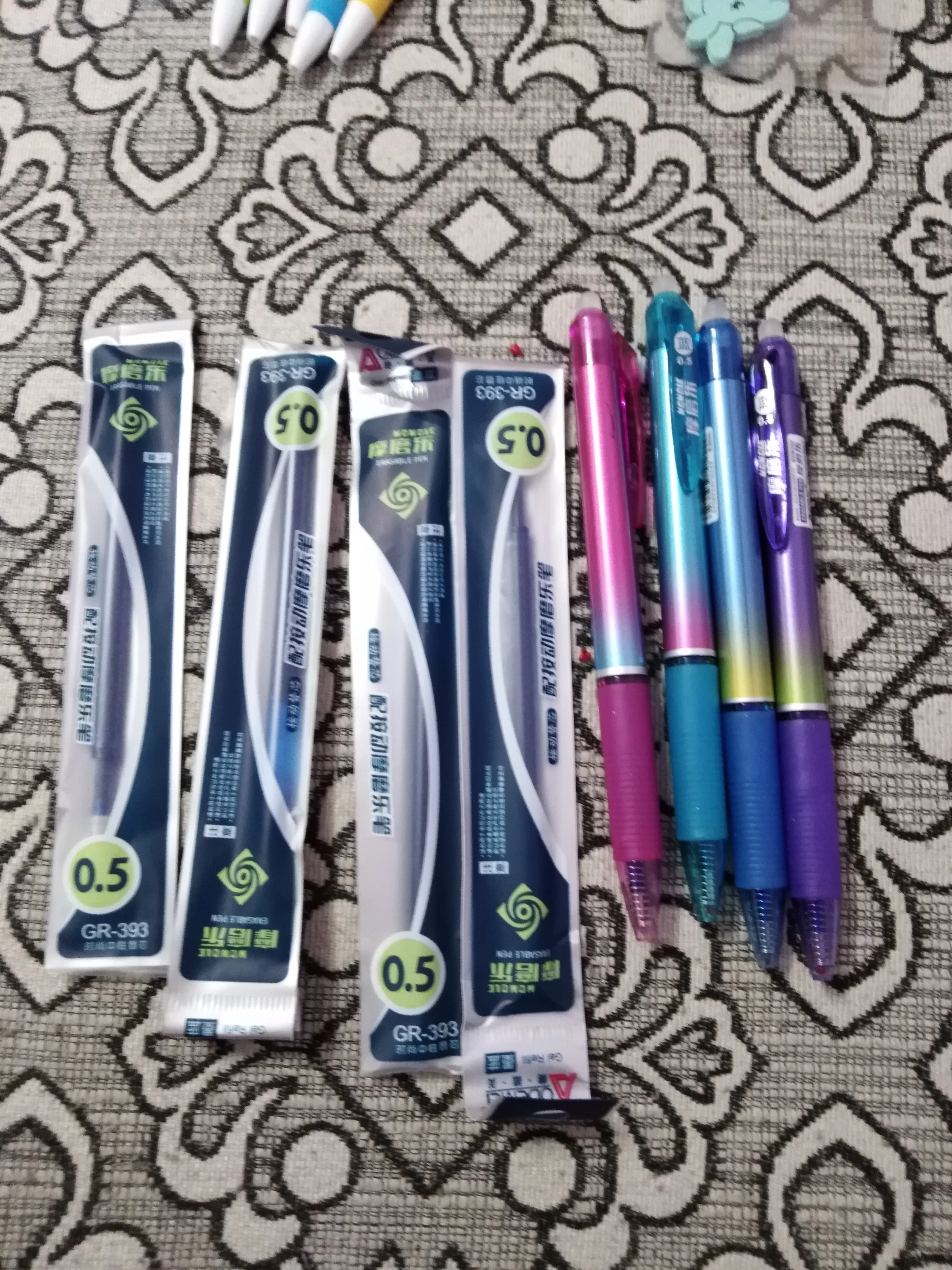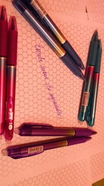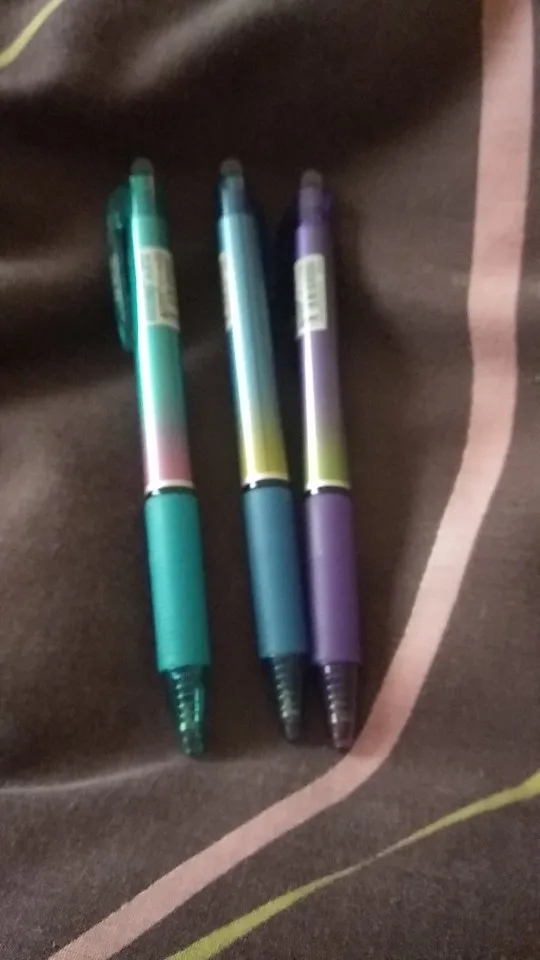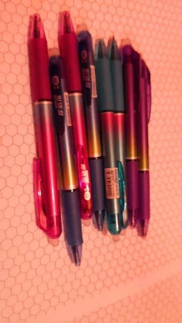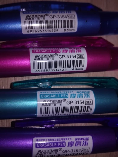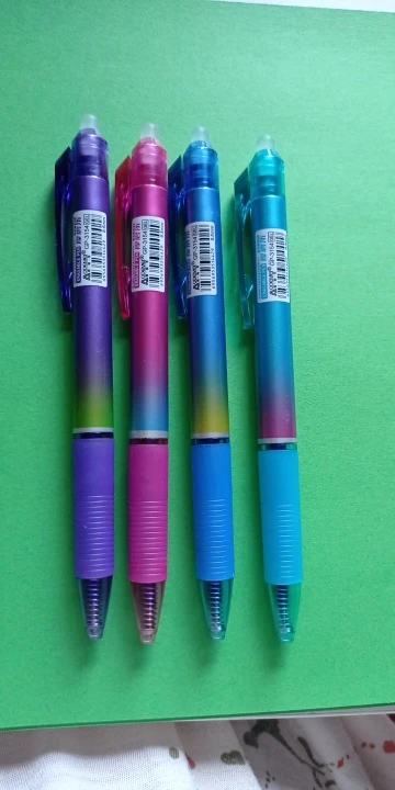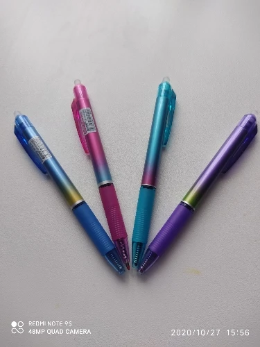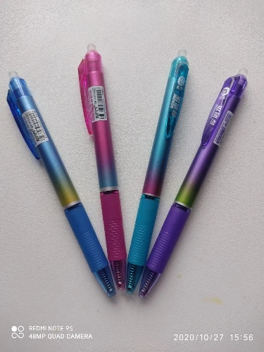 Ручки средние, пишут бледновато. Стираются неидеально, но сойдёт. Для тех кто любит тонкий корпус не подойдут, для меня вполне удобно, резинка для пальцев мягкая. Краска потихоньку уже слазит. Бракованных нет, все пишут. Заказ 6 ноября, получила 5 декабря. Продавец умничка, отправил сразу. 11 дней с Китая до России, но потом посылка шаталась по всей России. Цена 170 руб. Второй раз не закажу.