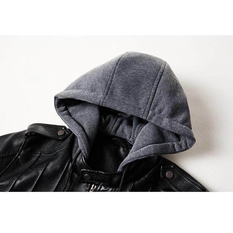 Мужская кожаная куртка с капюшоном, однотонная теплая байкерская ку...