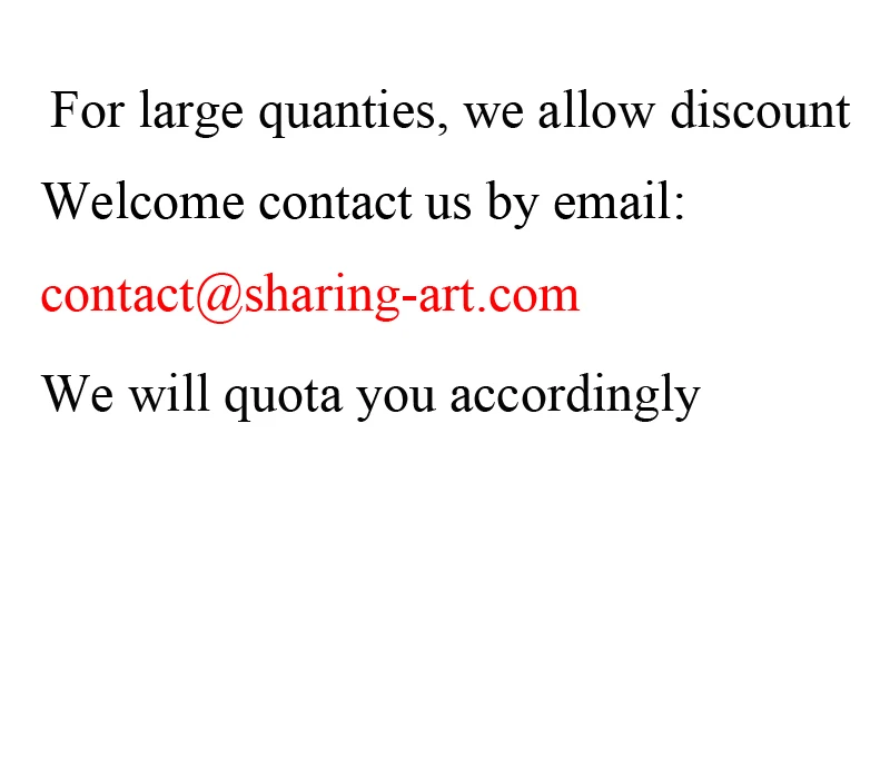 1. Пожалуйста, свяжитесь с нами, чтобы загрузить изображение, которое вы хотите настроить, вы можете отправить нам изображения в форматах JPEG, TIFF, PDF, AI или PNG, но, пожалуйста, убедитесь, что ваш образ в высоком разрешении с деталями, а не нечеткий для размеров печати, чтобы получить высокое качество печати. 2. Сообщите мне размер и границы, которые вы хотите заказать.3. Как эффекты освещения, цвет объектов может немного отличаться от изображения.4. Мы предоставляем скидку на массовое количество, пожалуйста, свяжитесь с нами заранее.5. Любые другие размеры, не указанные здесь, могут быть настроены, пожалуйста, свяжитесь с нами для получения более подробной информации.