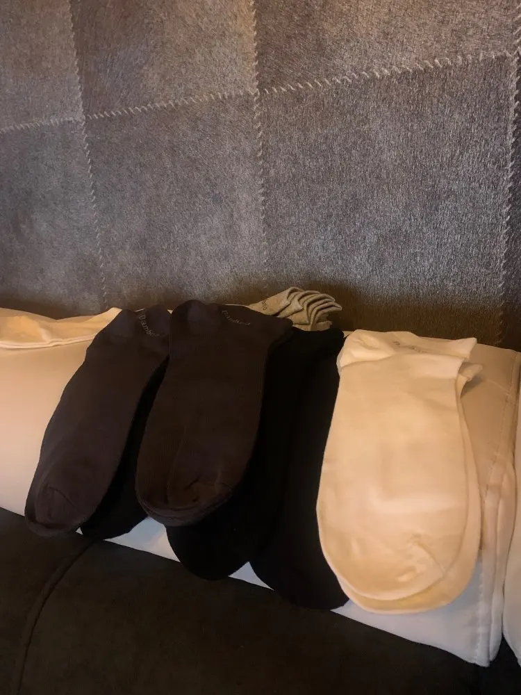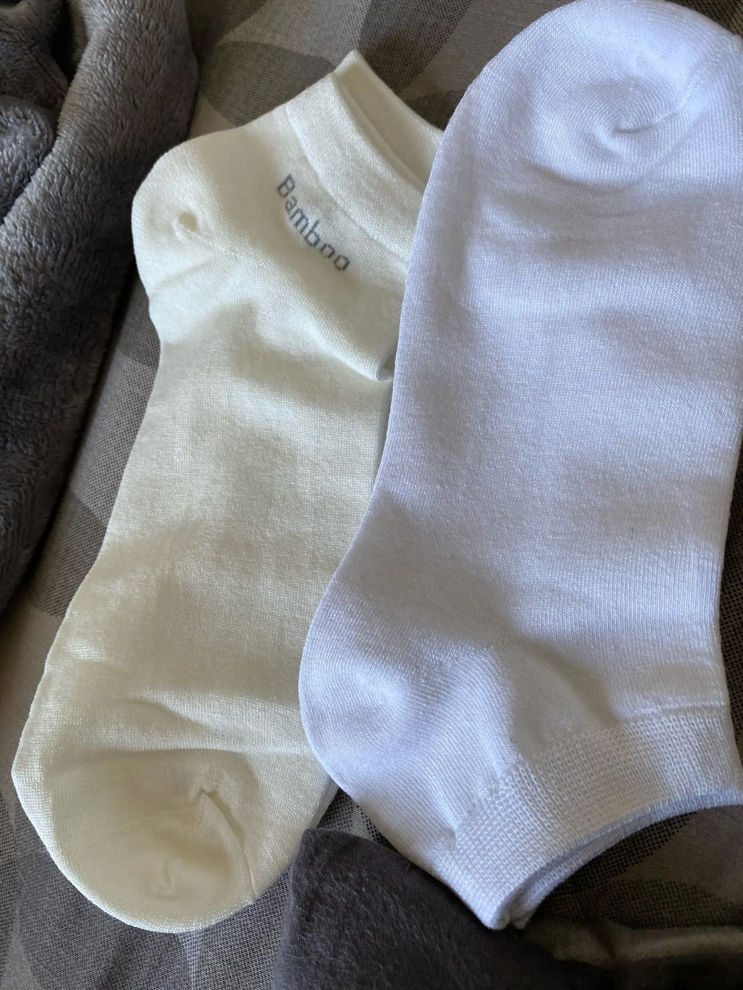 Носки действительно мягкие и красивые, моя единственная проблема заключается в том, что белый не белый, его бежевый/кремовый цвет, как вы видите, по сравнению с белыми носками, которые я получил от другого продавца. Это испорчило мою цель иметь белый быть частью униформы набора и, следовательно, не дать 5 звезд, но в целом, я доволен качеством.