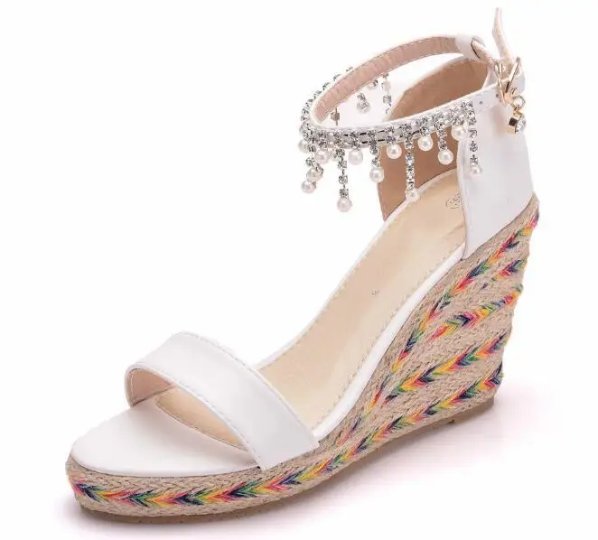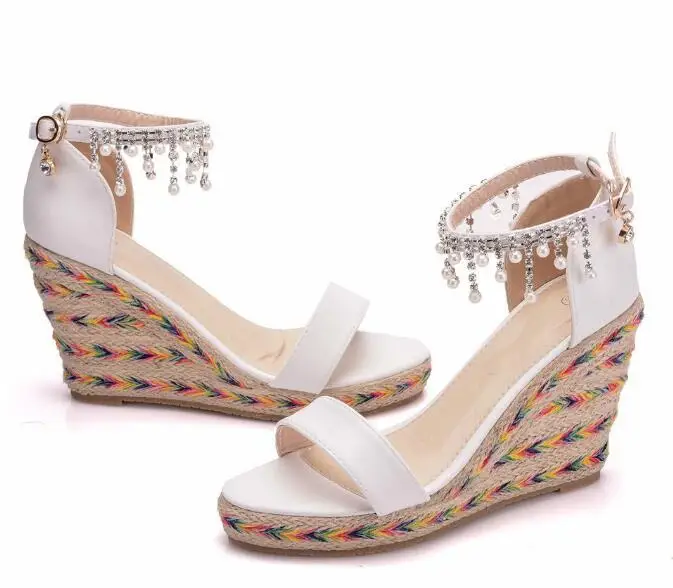 Женские свадебные босоножки на платформе, белые босоножки с кисточками и бисером, женские богемные свадебные босоножки со стразами, модель 33, 42