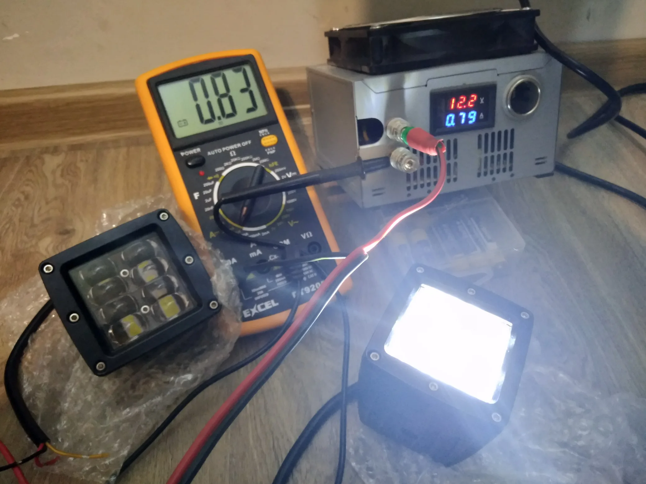 Абсолютно не точное описание товара! Полный обман! Фактическая потребляемая мощность 9,6W. Светят очень плохо! по сравнению с видео и фото в описании товара. Годятся в качестве подсветки, но никак не прожекторов с такой яркостью и дальностью луча как в описании. Категорически не рекомендую! на фото: напряжение АКБ 12,2V и потребляемый ток 0,81A.