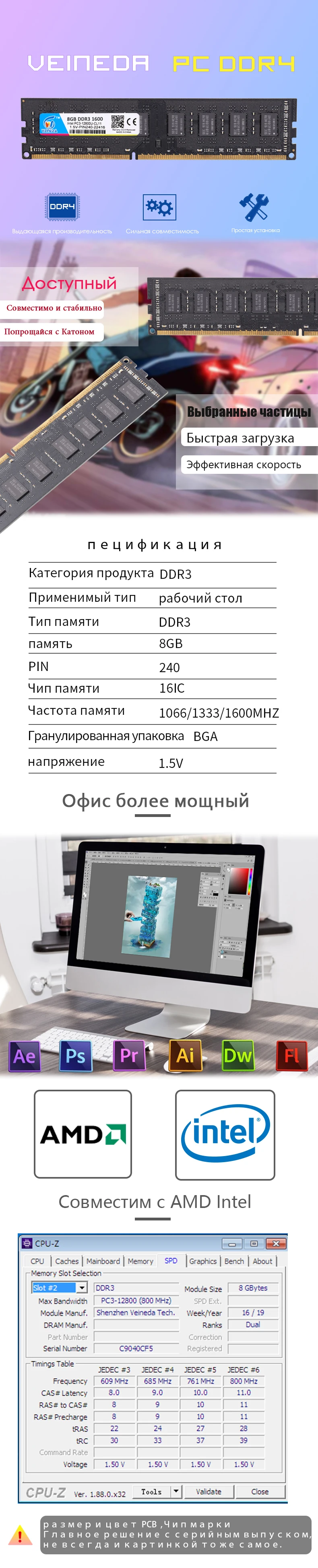 VEINEDA DDR3 4 ГБ 8 ГБ память оперативная память DDR 3 1333 1600 для всех или для некоторых настольных ПК AMD PC3-12800 совместимость 2 Гб совершенно новый