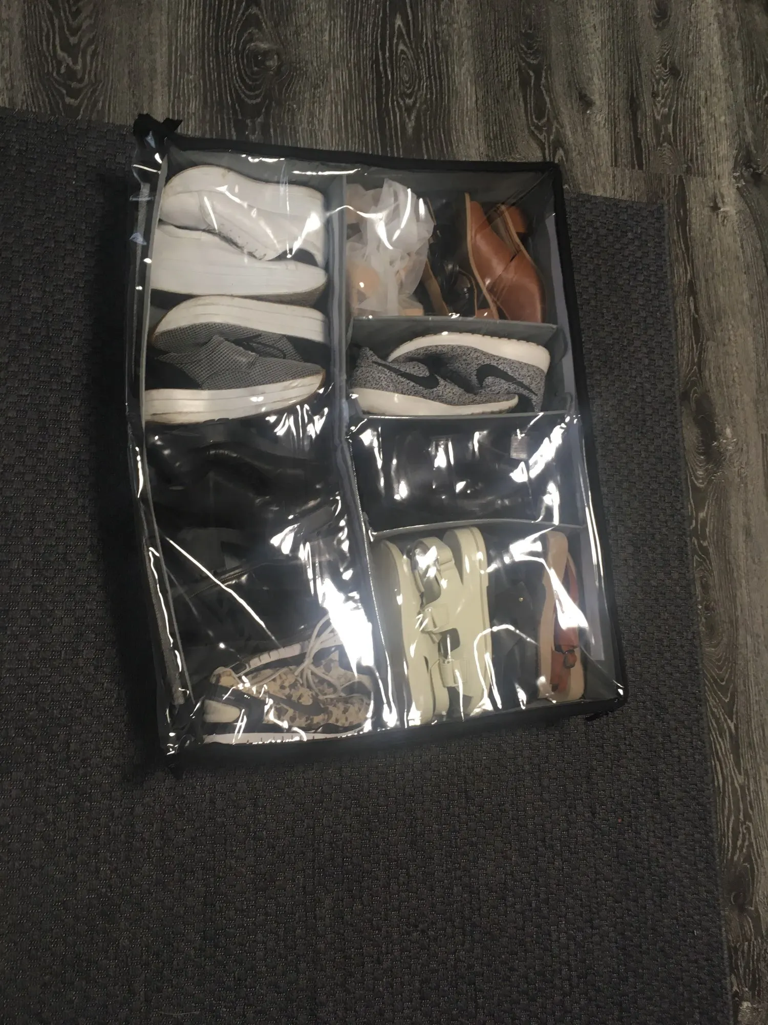 Доставка очень быстрая. До СПб за 3 дня! Короб супер-прочный. Отличного качества. Вместимость: 10 пар мужа с размером обуви 43 (кроссовки, кеды, сандали). Брали чтобы хранить обувь в кровати с подъемным механизмом. Очень удобно что прозрачная крышка у короба, поднимаешь кровать и видишь где какая пара лежит. Раньше хранили в оригинальных коробках. Когда убрали в короб, значительно сэкономили место для хранения. Продавцу огромное спасибо!