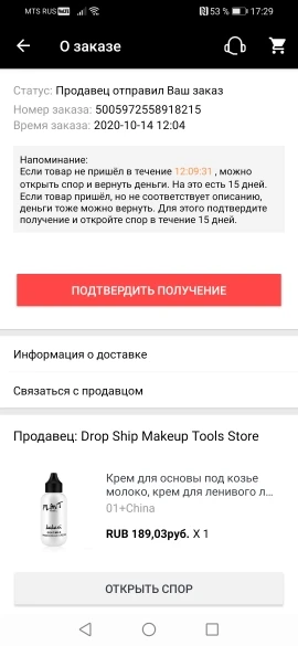 Посылка шла ооочень долга, думала уже не прийдет. Бутылочка очень маленькая, но экономная, крем ложиться на кожу очень хорошо. Продавец всегда отвечал на вопросы. Продавца и товар рекомендую, единственная проблема- долгая доставка.