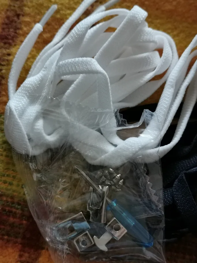 Посылка шла полтора месяца, но это того стоило. Качество на высоте! Шнурки упакованы в индивидуальный зип-пакет, внутри которого лежит пакетик с фурнитурой, маленькие винтики и мини-отвертка крестовая. Шнурки тянутся, это резинка, но почему-то разной длины. Один 103, другой 102 см)) Рекомендую товар и продавца!