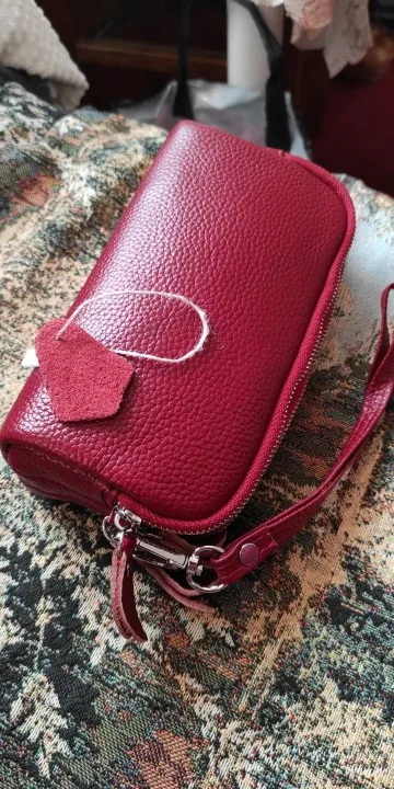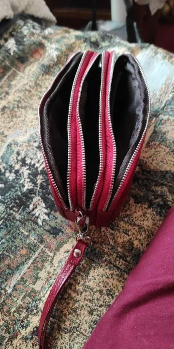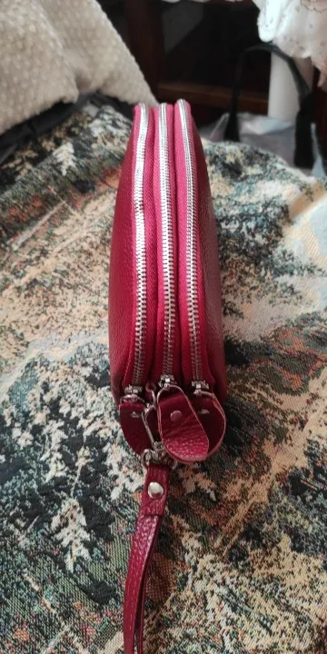 Хороший кошелек,вернее маленькая сумочка на руку.Кожа натуральная.Имеет три отдельных отделения на замках.В одном отделении есть ещё кармашек на молнии.