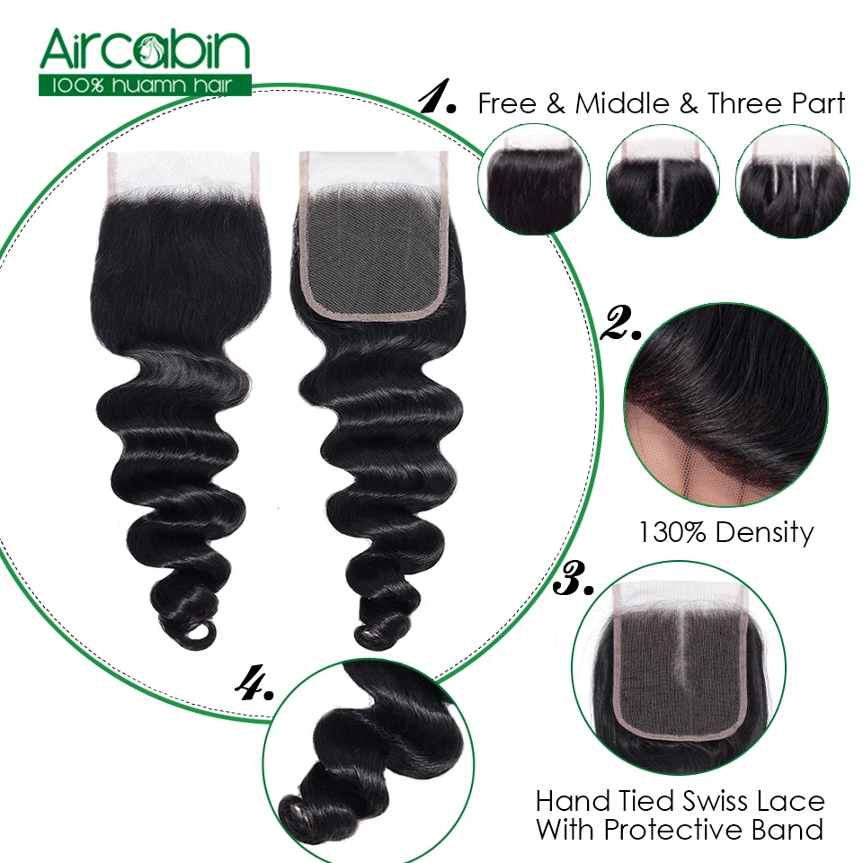 Воздушные волнистые прозрачные бразильские человеческие волосы с закрытием на шнурке, 4 х4, свободныеСредниетри части, натуральный цвет, Remy