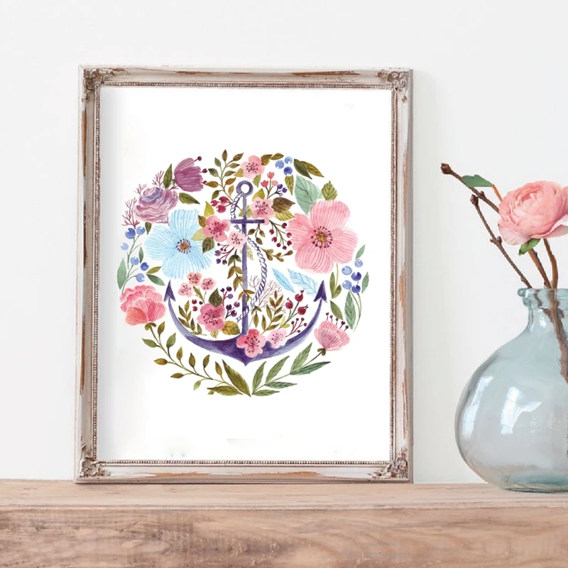 Ручная работа акварельный якорь с цветами настенная живопись холст скандинавские плакаты и печать, Картина Настенная морская Живопись Домашний Декор