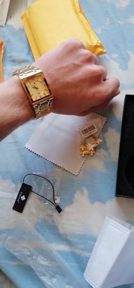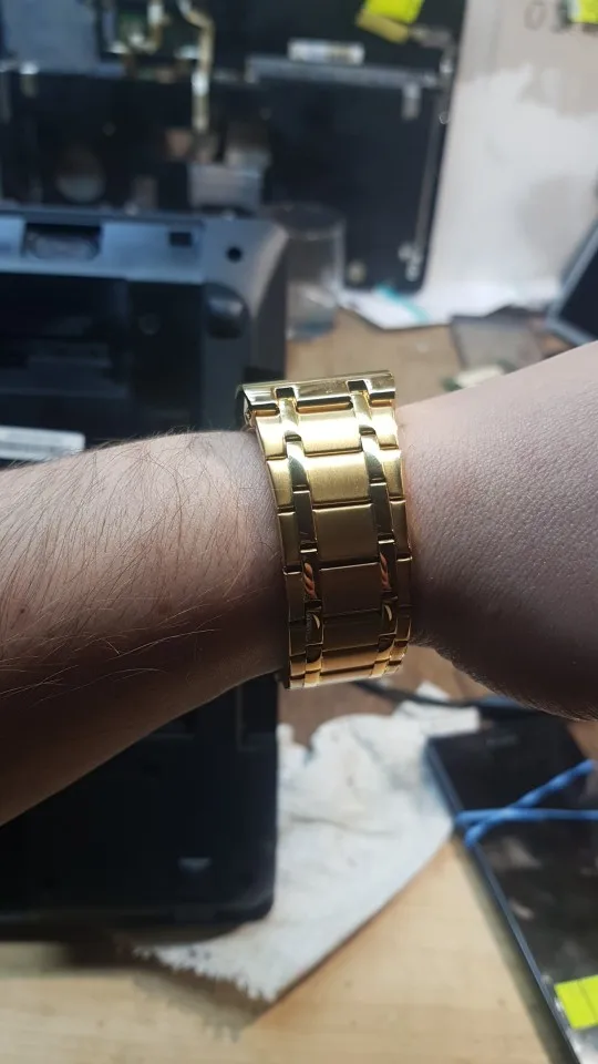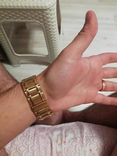 Часы понравились, на руке ощущаются очень тяжело) надеюсь что их внешний вид не изменится долгое время) был опыт, весь золотой напыл стирался за неделю) выглядят добротно) звенья убрал лишние чтоб по руке было хорошо, но уж очень сложно было их убирать, обычно на любой другой китайщине за минуты 3 справлялся, здесь же около часа ковырялся, в общем на первый взгляд всё гуд, здорово и классно, брать не брать, решать вам) мне Часы зашли по душе) пришли тоже быстро, недели полторы ждал до Самары)