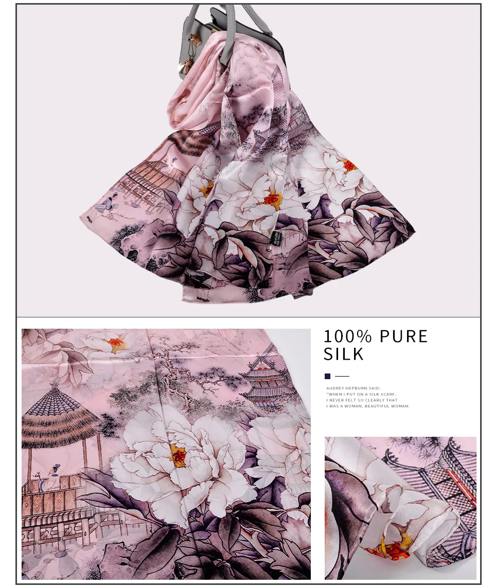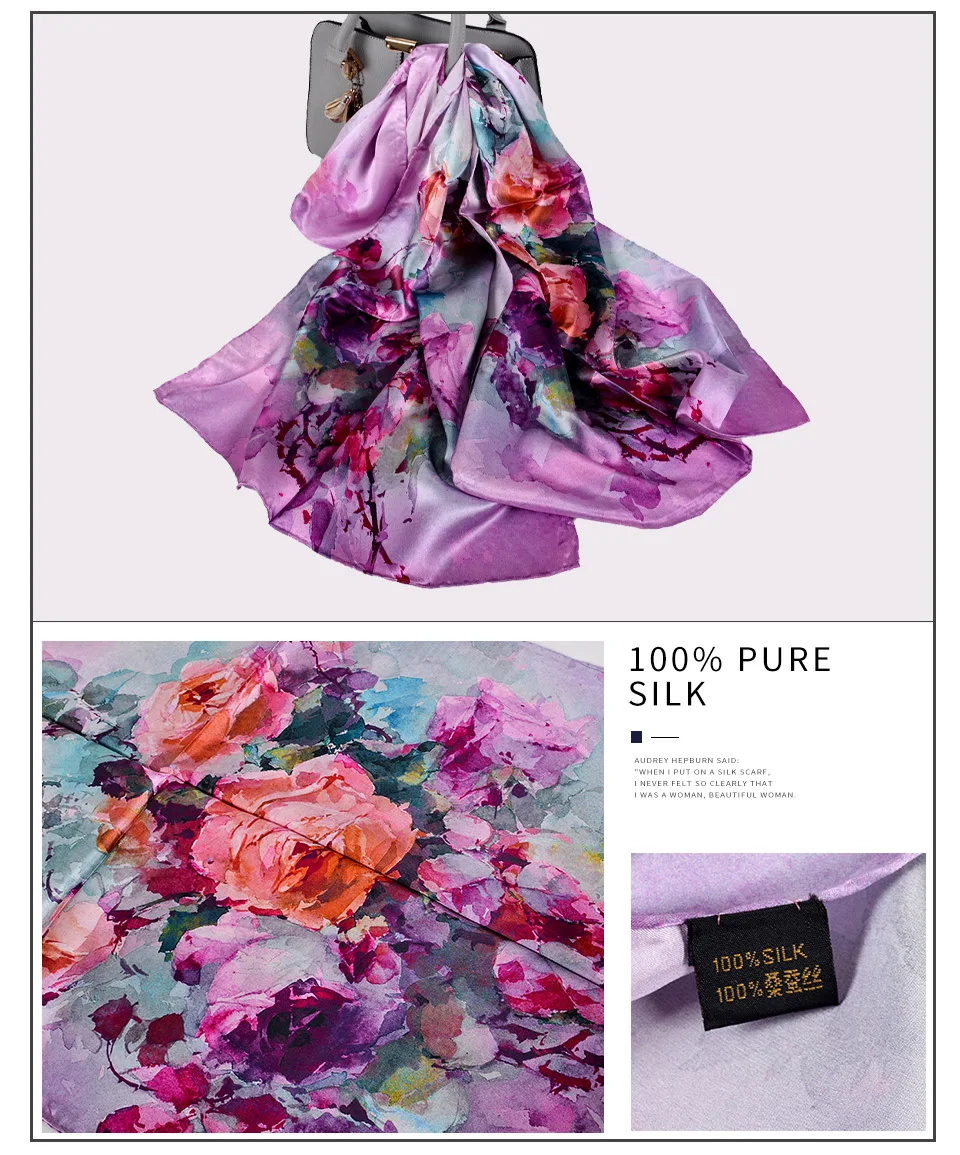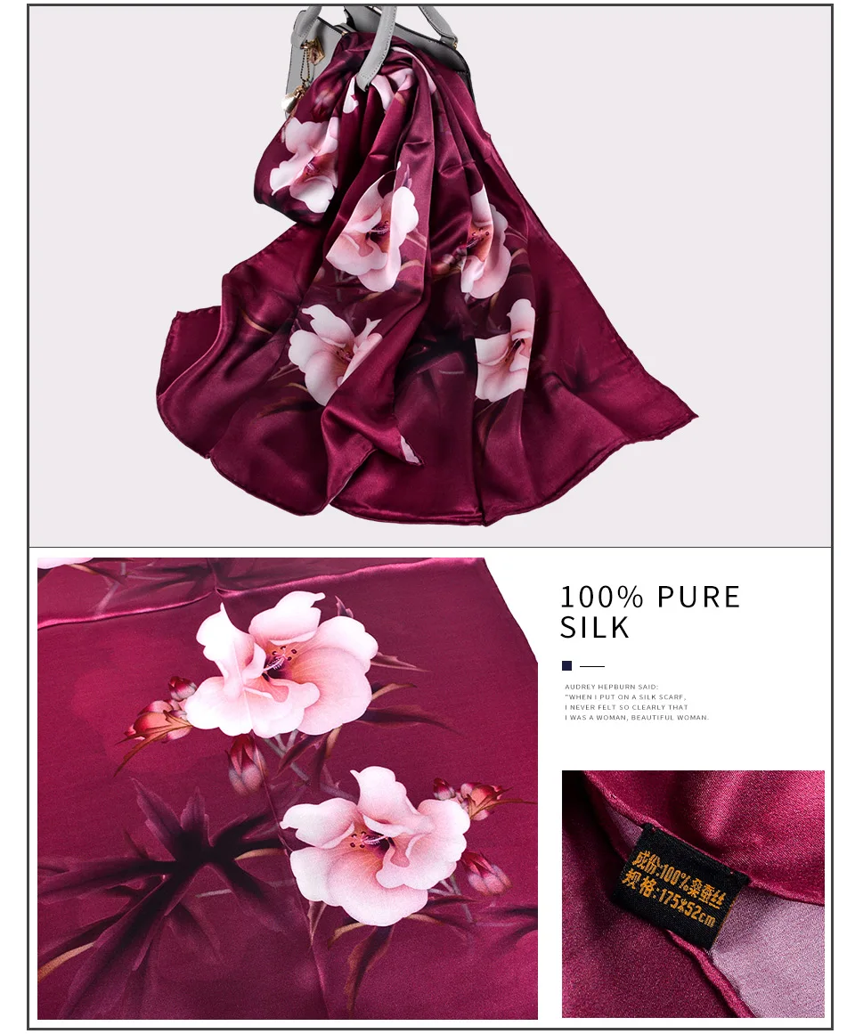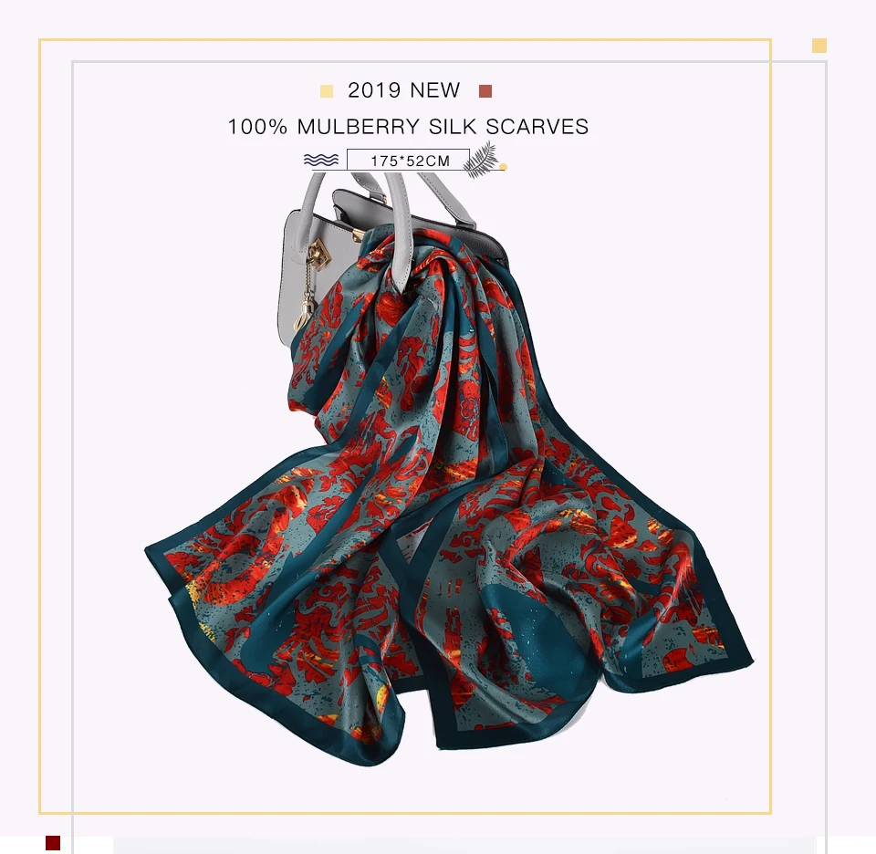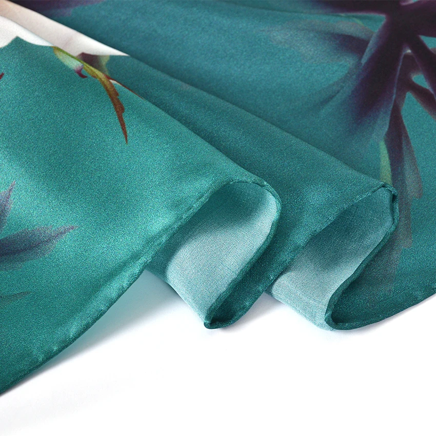 Женский шелковый шарф BYSIFA, темно-зеленый длинный шарф из 100% шелка с цветочным принтом, 175*52 см