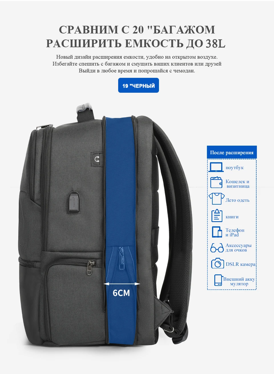 получил рюкзак с Китая за 10 дней до г Якутск. тестил с 13.08. удобный рюкзак , нагружаются рюкзак хорошо , много отделений все помещается ,на тренировки удобно загружать последнее отделение ,ни разу не было,что бы не влезло все ,что надо . был под дождем, все отлично как производитель заявляет качество изготовления отличное ,кабель. для зарядки удобен, был бы ещё фиксатор ,что бы кабель в рюкзаке не выскакивал ,когда подключает кабель для зарядки ,поэтому у меня кабель постоянно подключен и лежит во внешнем кармашке .