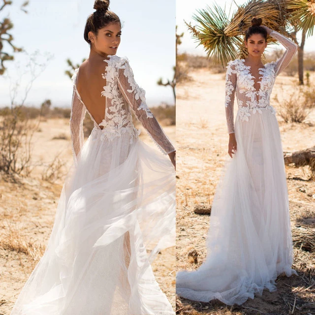 Длинные свадебные платья-трапеции с длинным рукавом и кружевной аппликацией в стиле бохо, индивидуальное изготовление, свадебное платье со шлейфом