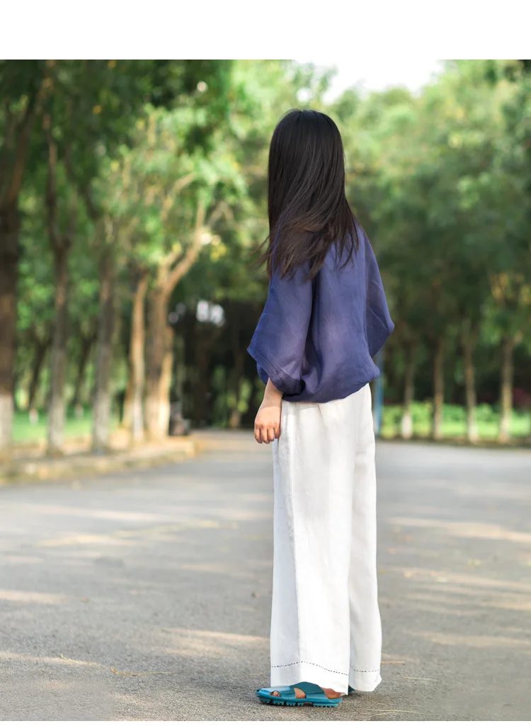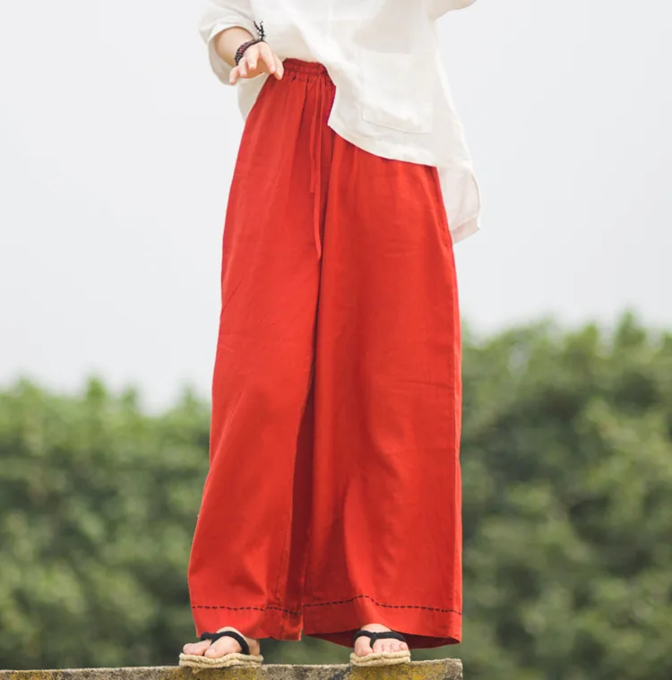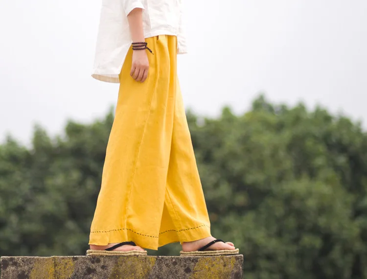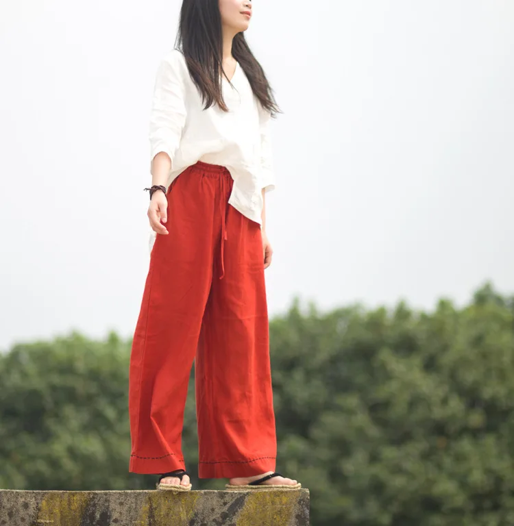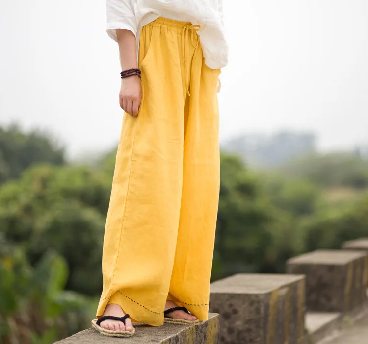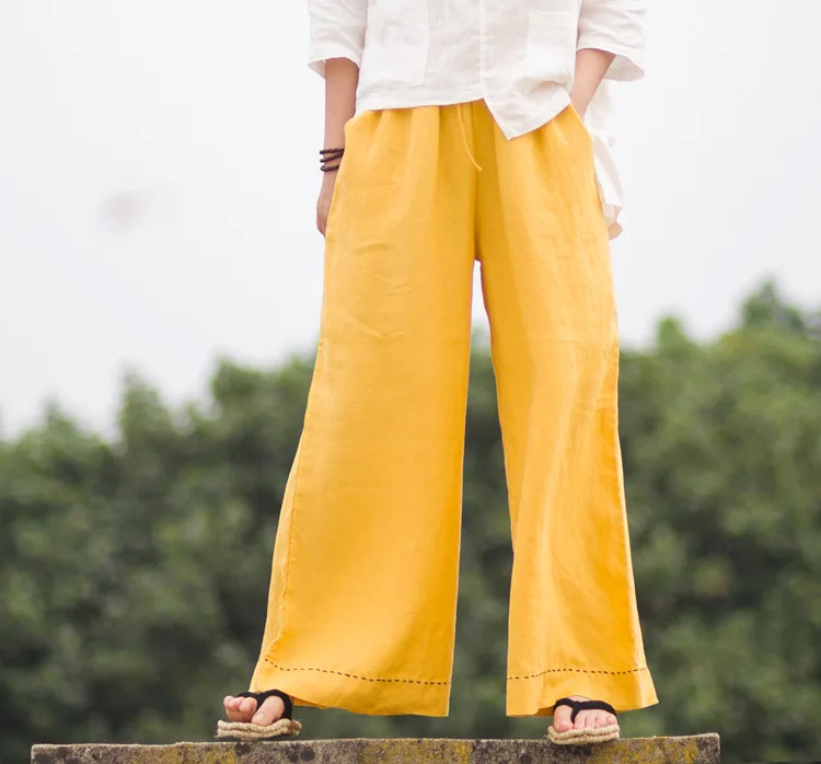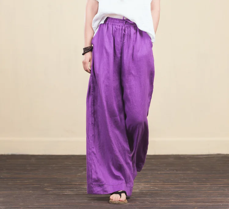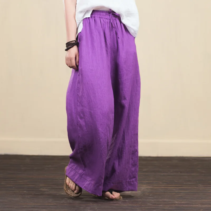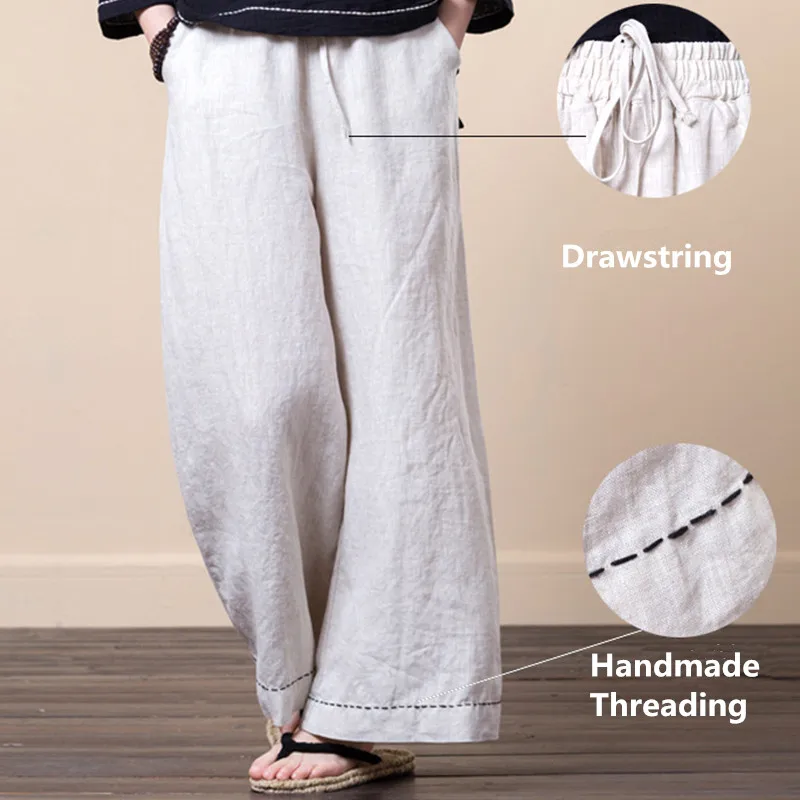 Женские брюки с широкими штанинами LZJN, однотонные длинные брюки из 100% льна с эластичным поясом и карманами, на лето и весну, размера плюс