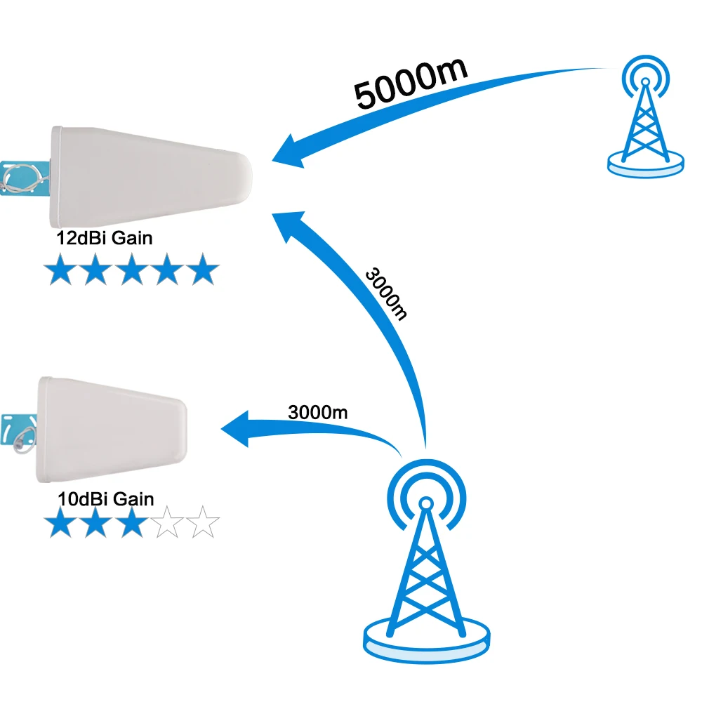Усилитель поставляется с наружной антенной 12 дБи. Это лучшая наружная антенна для многодиапазонных ускорителей. Максимальная дальность приема составляет 5000 метров.