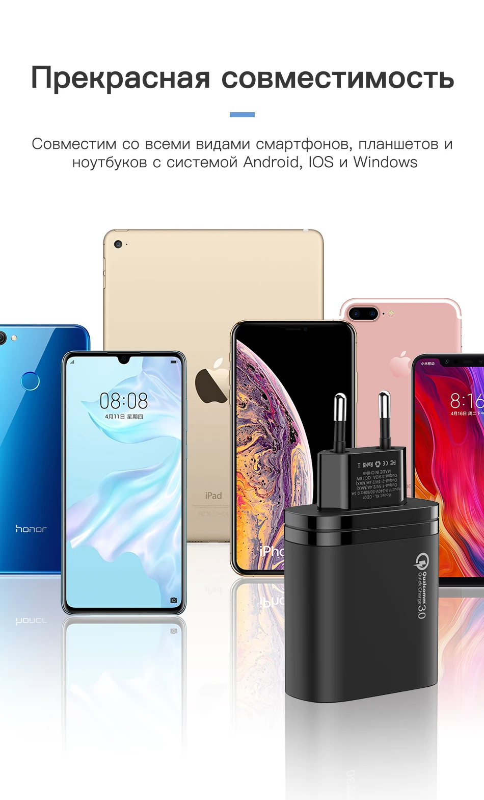 Заказал два адаптера, но к сожалению один оказался бракованным, не поддерживает быструю зарядку, время зарядки более 2 часов 30 минут. Второй адаптер поддерживает но не дотягивает до 3 ампер, время где-то 1 час 10 минут, при том что моя оригинальная зарядка заряжает за 50 мин, это все с 30% заряда батареи. Оценку снижать не буду так как продавец вернул деньги за второй адаптер. Если не принципиально, то можете взять заряжать по три устройства за один раз, но номинальную мощность он не выдает. Чудес от такого не ждите.