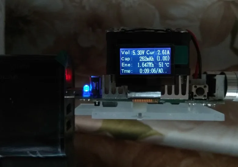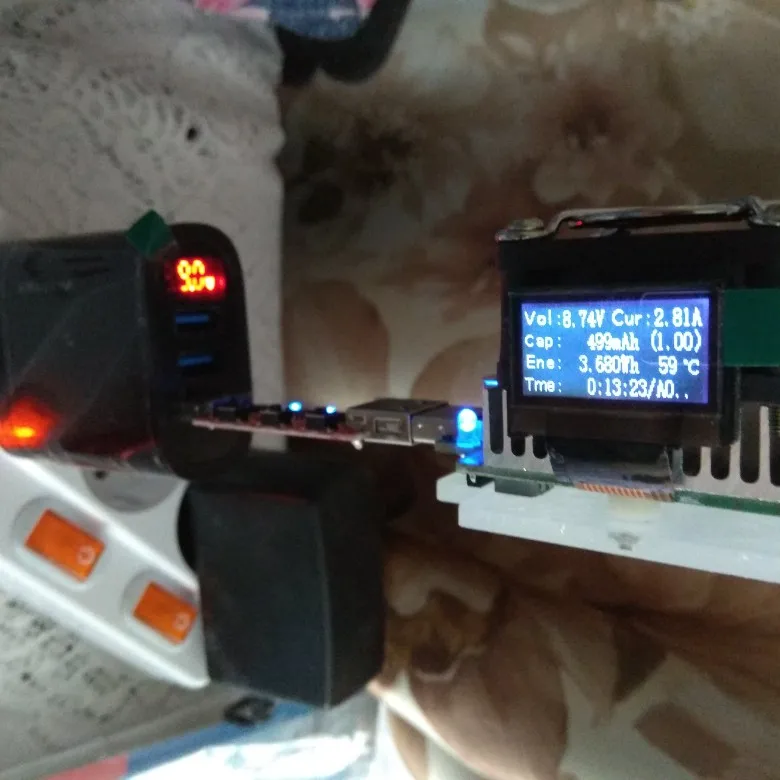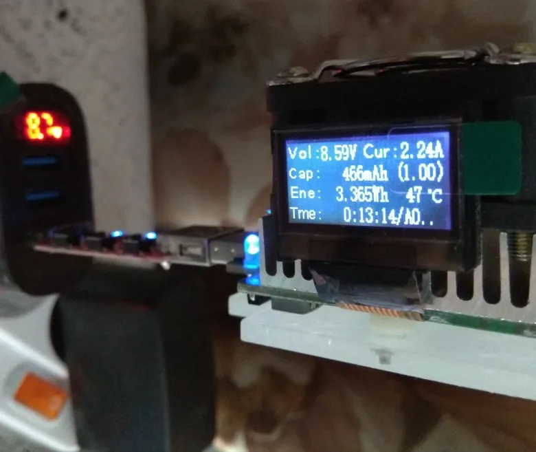 сначала показывал какую-то хрень, цыфры корявые, не полные, букву А не показывал,грузонул его 4,7А начал пищать, грется, и начал норм показывать, 5,4А нечем нагрузить моя мах нагрузка 4,78А, показывает напряжение 1и2 юсб, отдельно напряжение быстрой зарядки, ток общий, в холостую напряжение 5,1в 1и2юсб, 5,0в быстрой, 1-2юсб больше нагрузки больше вольтаж до 5,4в, вольтаж проверял мультиметром совпадает, ток кабелем с дисплеем совпадает, грется правда до 70градусов при полной нагрузке,посмотрим на сколько хватит