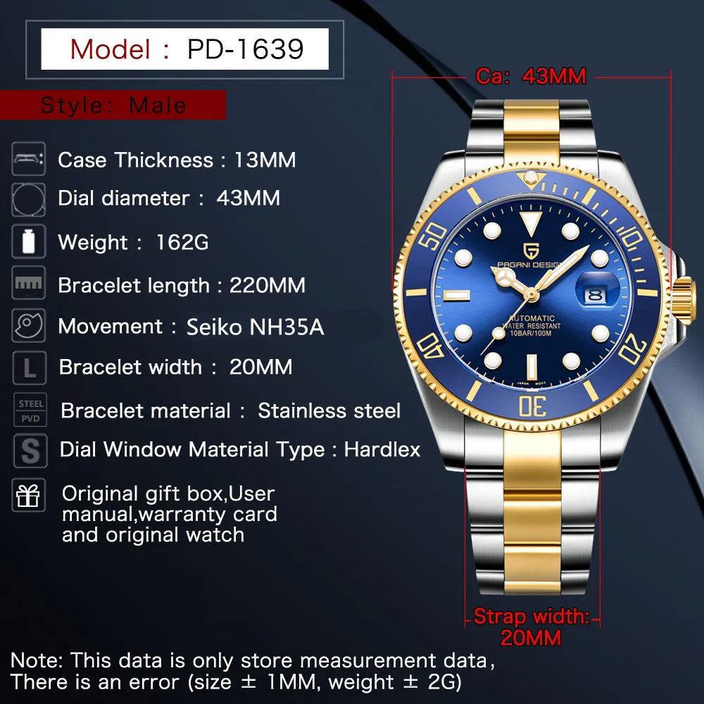 PAGANI дизайнерские классические роскошные мужские автоматические часы с синим циферблатом водонепроницаемые механические погружные часы NH35A Relogio Masculino + коробка