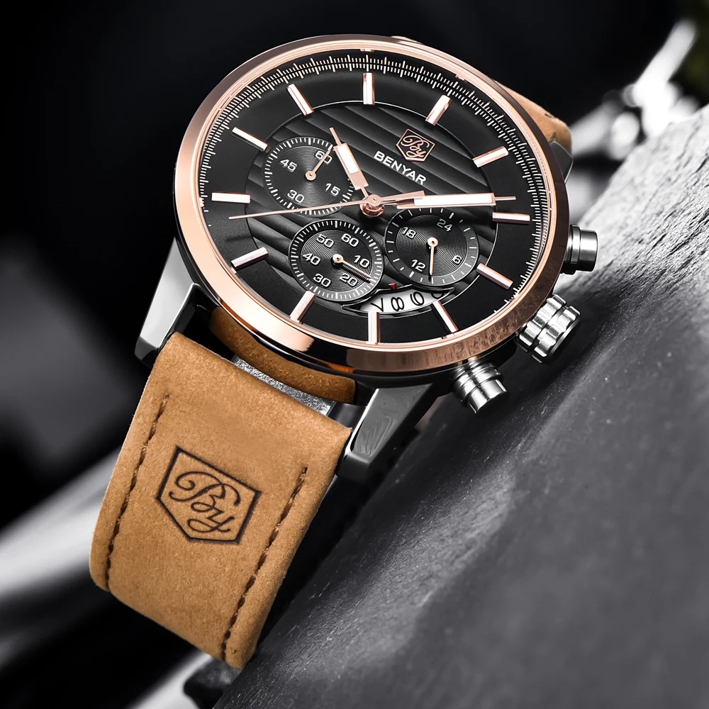 Часы мужские кварцевые BENYAR, с кожаным ремешком, повседневные, 2019