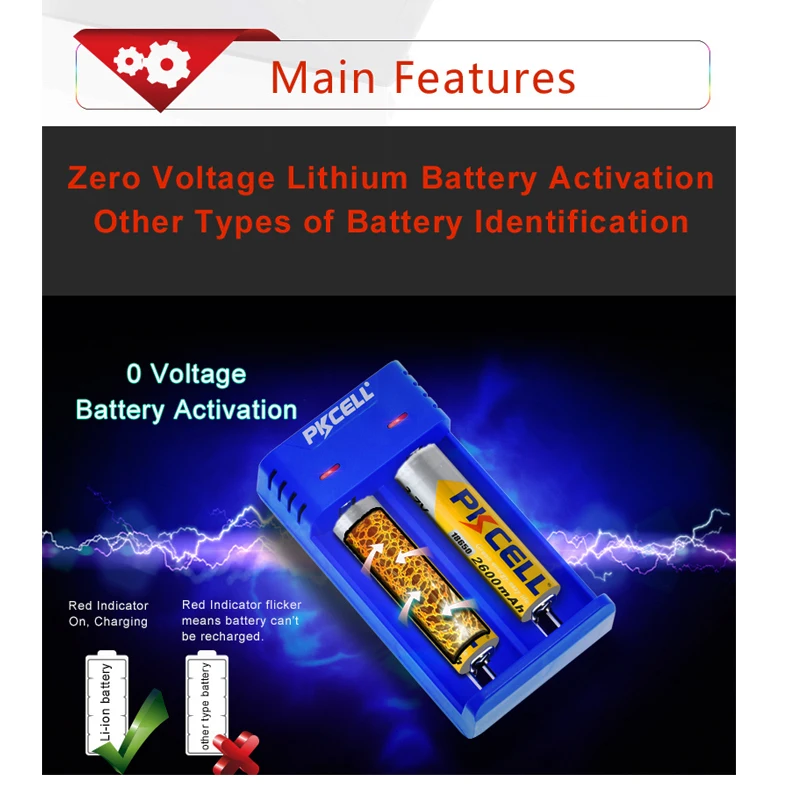 PKCELL 18650 зарядное устройство 3,7 в AAAAA 26650 16340 16650 14650 18350 18500 18650, зарядное устройство для литий-ионных аккумуляторов USB 5 в 2 А, 2 слота