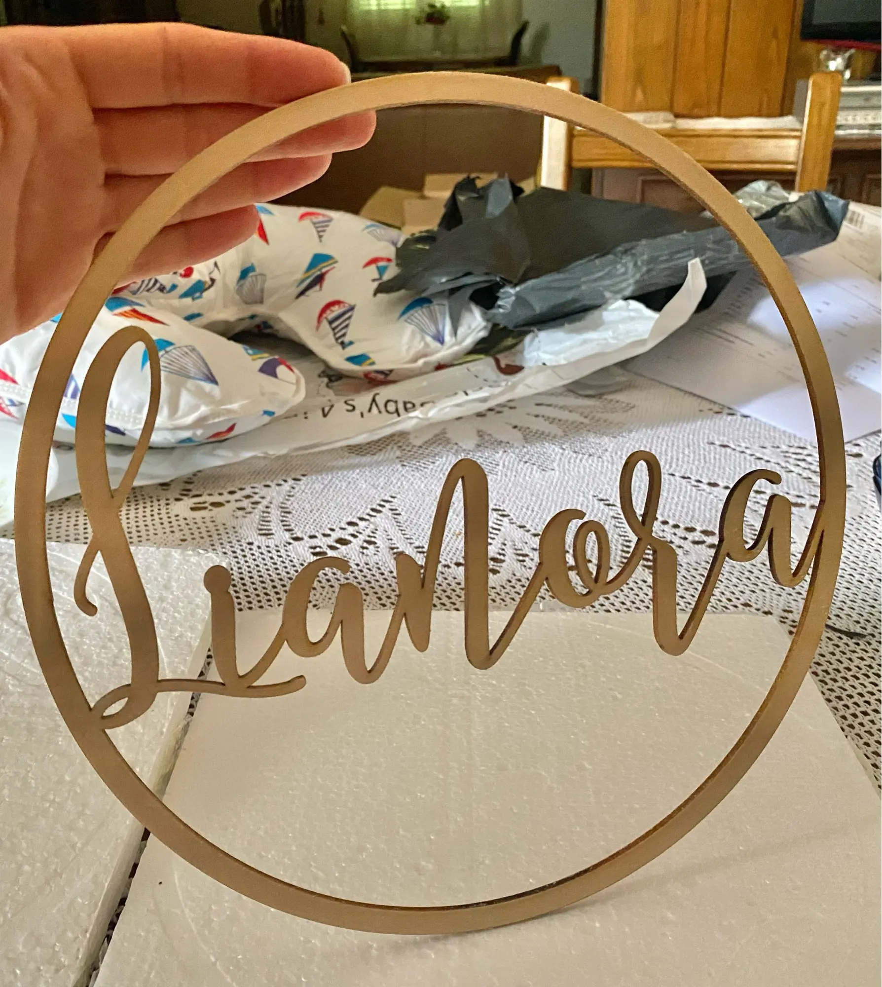 Отличная работа, продавец отвечал сразу и дал возможность выбрать из разных вариантов (я изначально хотела написать три слова, но потом решила оставить только имя). Доставка очень быстрая, упаковано хорошо. Но ширина дерева к сожалению тоненькая, так что будте аккуратны при распаковке.