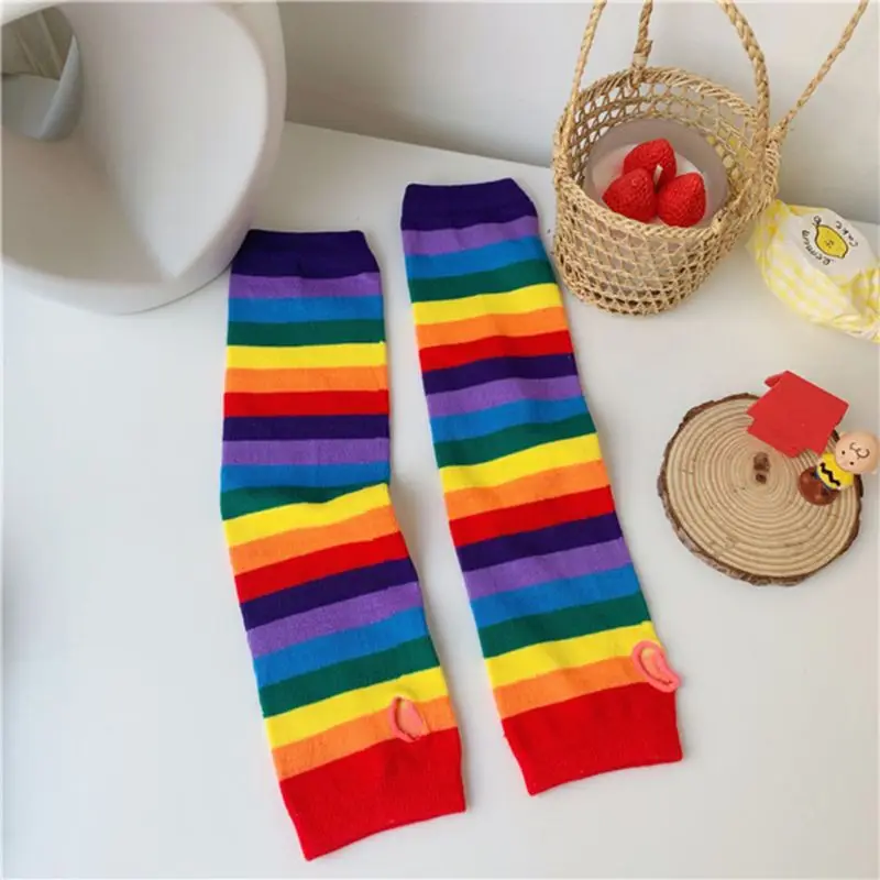 Женские вязаные перчатки в стиле Харадзюку, до локтя, без пальцев, с радужными полосками, для защиты от солнца, для костюма на Хэллоуин