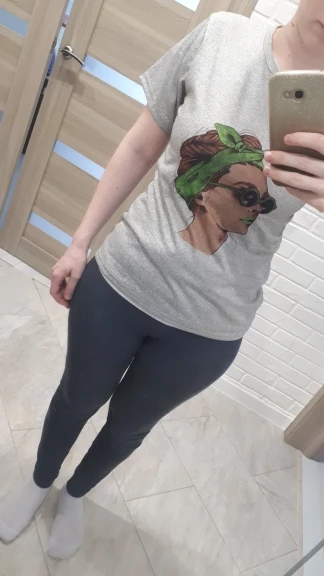 Футболка конечно чистая синтетика. Но смотрится неплохо. Размер L взяла на 42-44, подошла хорошо.