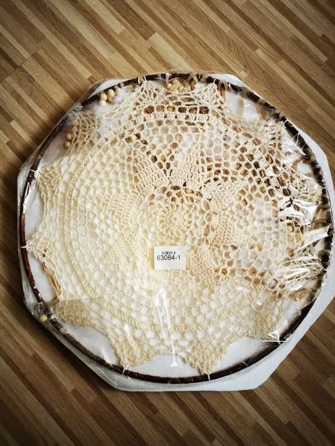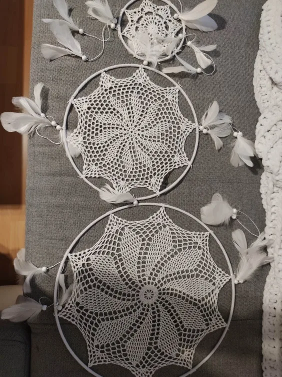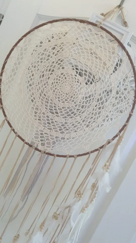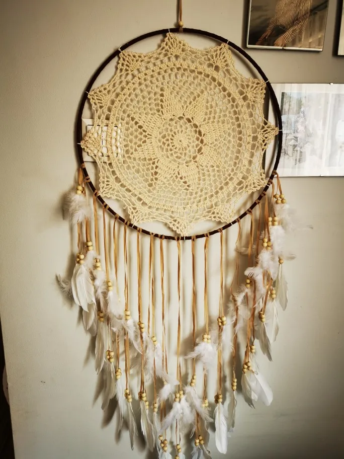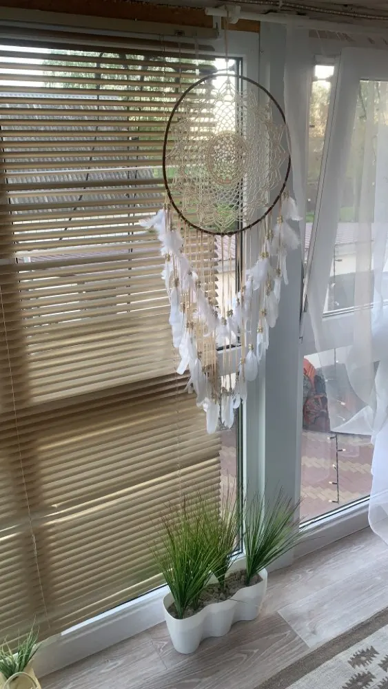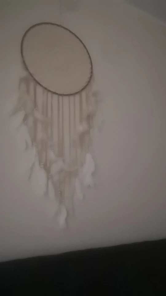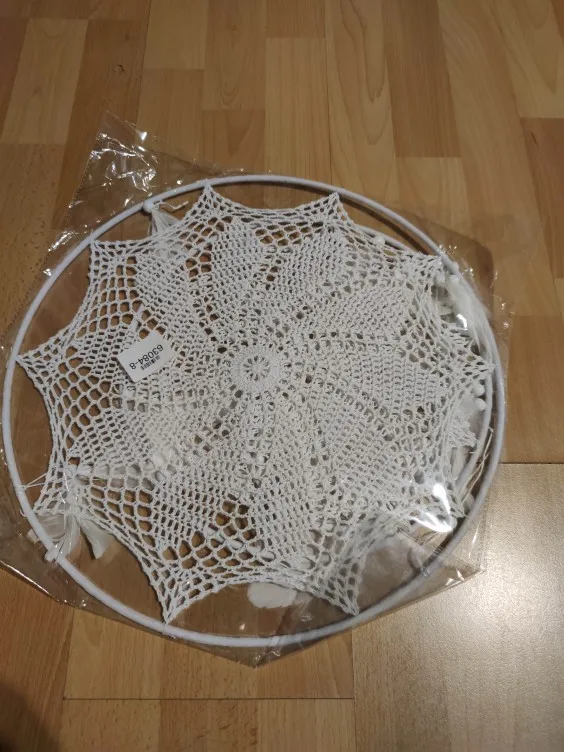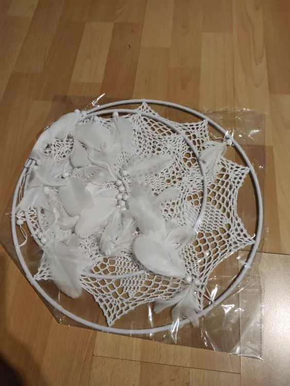 Красивый большой ловец снов. Упакован был хорошо, кольцо на толстом пенопласте, но вот доставка подкачала. Посылка пришла вся мятая, пентпласт сломан, в итоге пришлось в ручную выравнивать кольцо (оно из проволоки), но идеально ровно не получилось. Вид не очень.