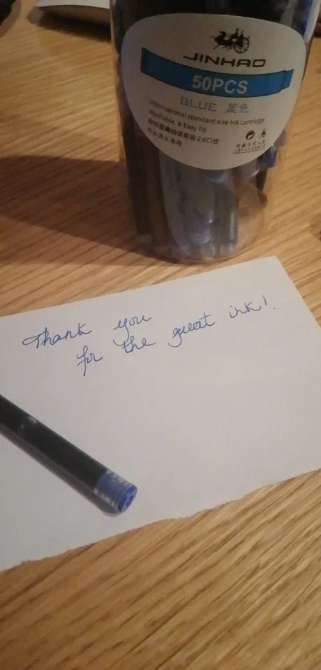 пишет хорошо, но не подошли к ручкам Jinhao 35 Series и https://www.aliexpress.ru/snapshot/0.html?orderId=5007506210292878&productId=32998278298&edm_click_module=order_detail&tracelog=rowan&rowan_id1=sellerSendAllGoodsToBuyerV2_1_ru_RU_2020-12-15&rowan_msg_id=2878500750621028$09fbf33f386849fd9d90a984ee54b5a4&ck=in_edm_other, хотя писали обратное.