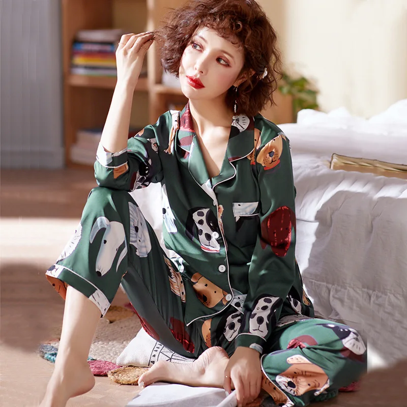 Женская зимняя атласная пижама с длинным рукавом и цветочным принтом