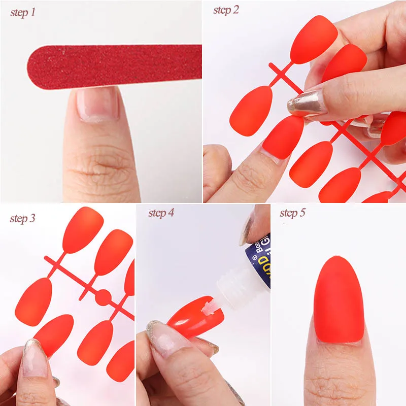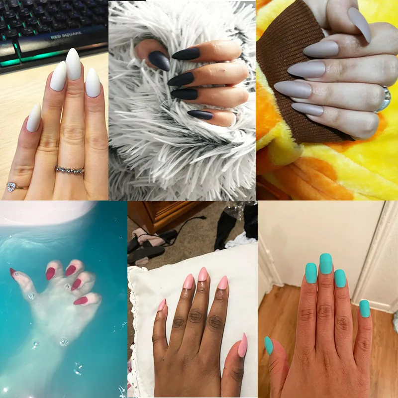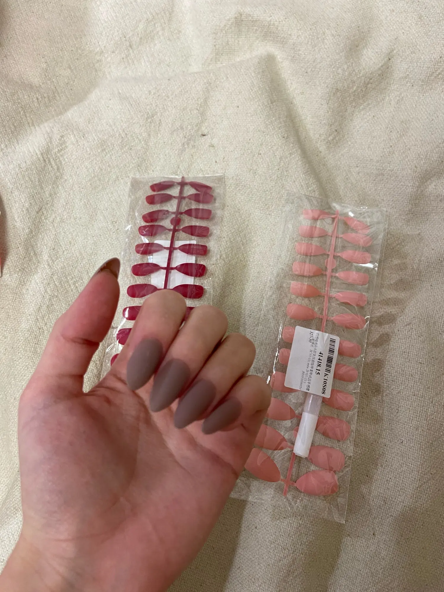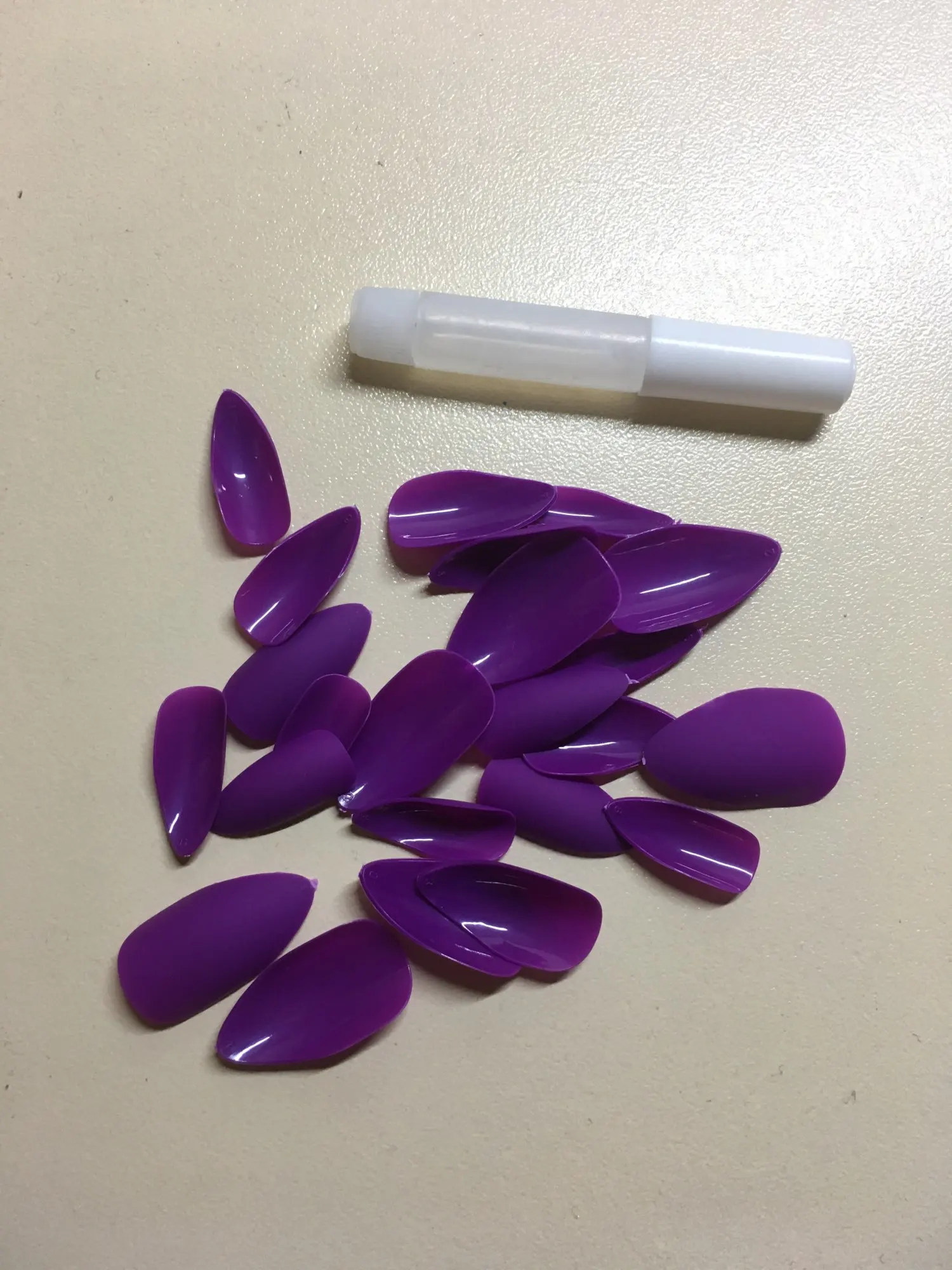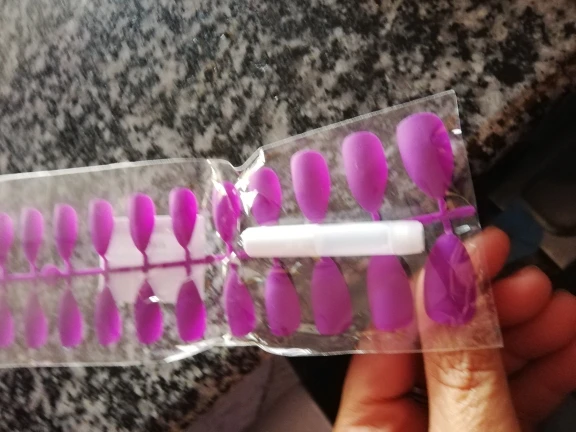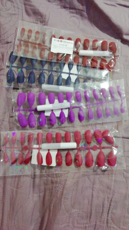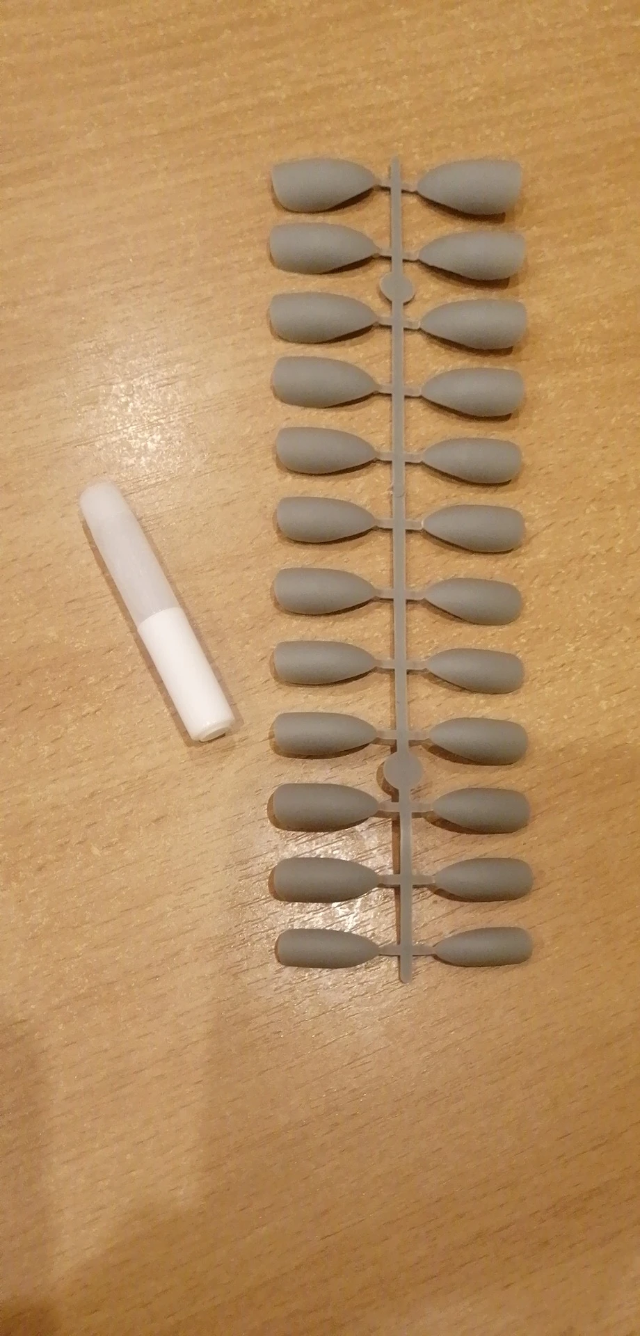 Заказ пришёл очень быстро. Примерно за 2 недели. Ногти хорошие, не отваливаются, не гнутся. Большеваты по размеру, но это не страшно, можно обрезать. Заказывала 3 упаковки разного цвета, цвет немного отличается от картинки, но в принципе меня устроил. В каждой упаковке ногтей мини клей. Ногти острой формы, немного изменила для себя, форма соответсвует фотографии на сайте.