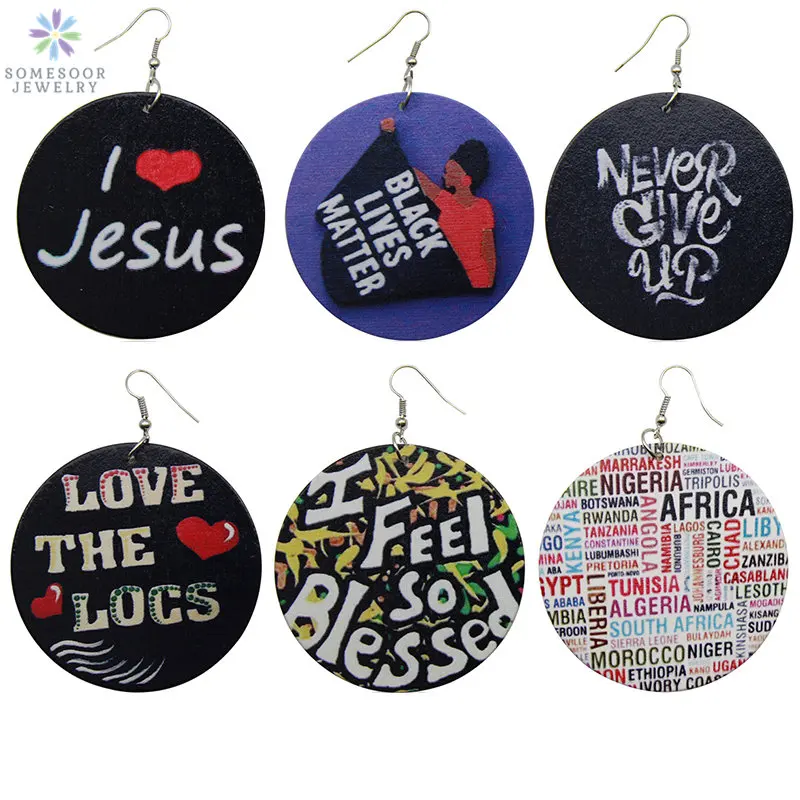 Черные высказывания SOMESOOR, африканские круглые деревянные серьги-подвески, афро этнические жизни, материя, Locs, Иисус, Женские Подвески с принтом, украшения для ушей