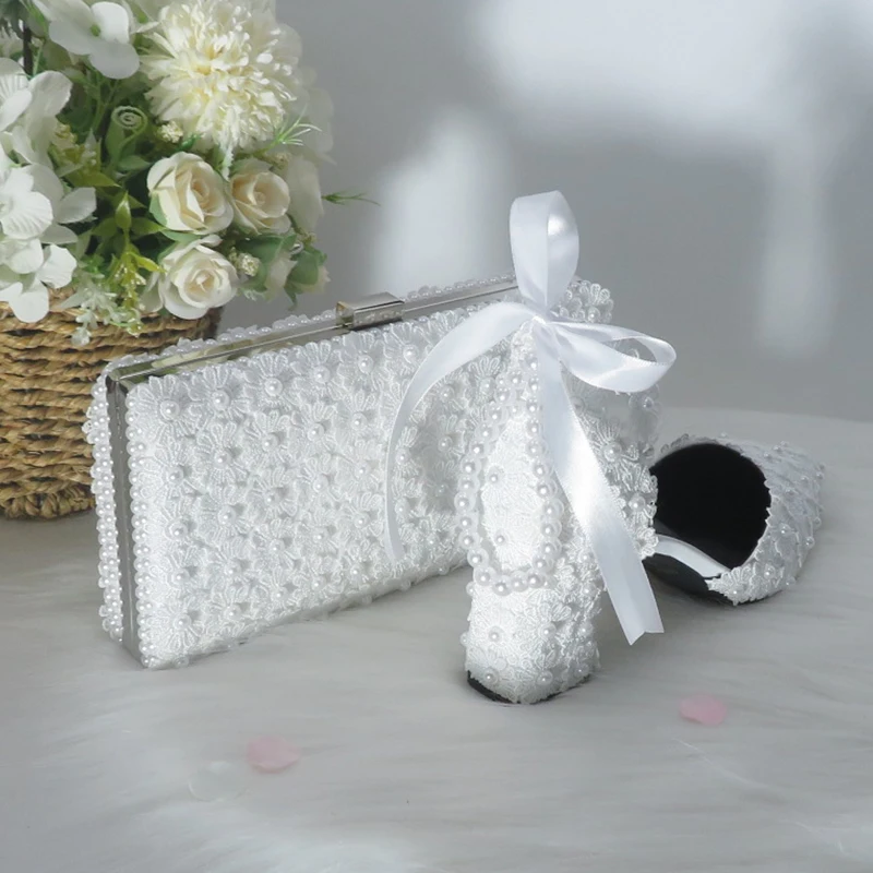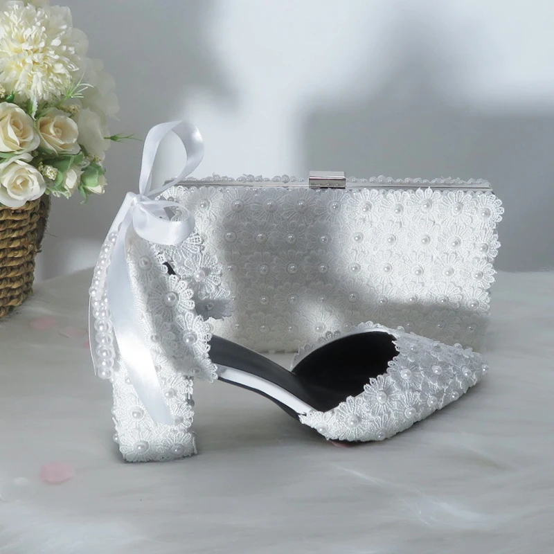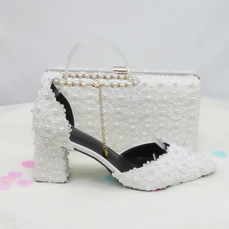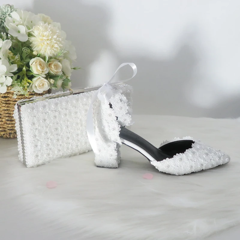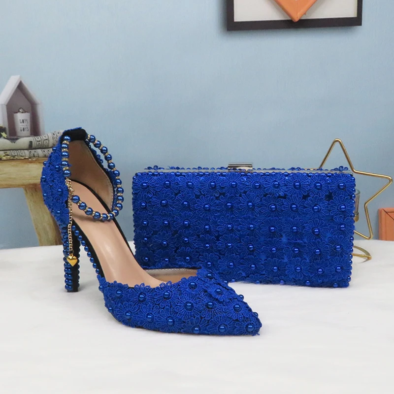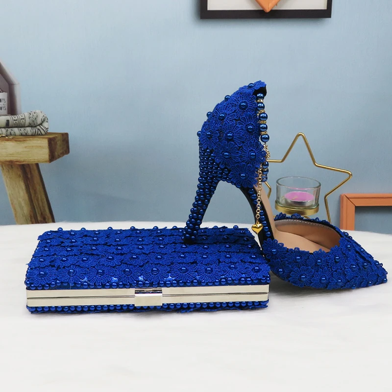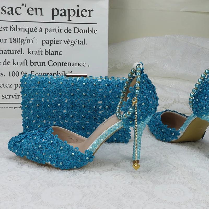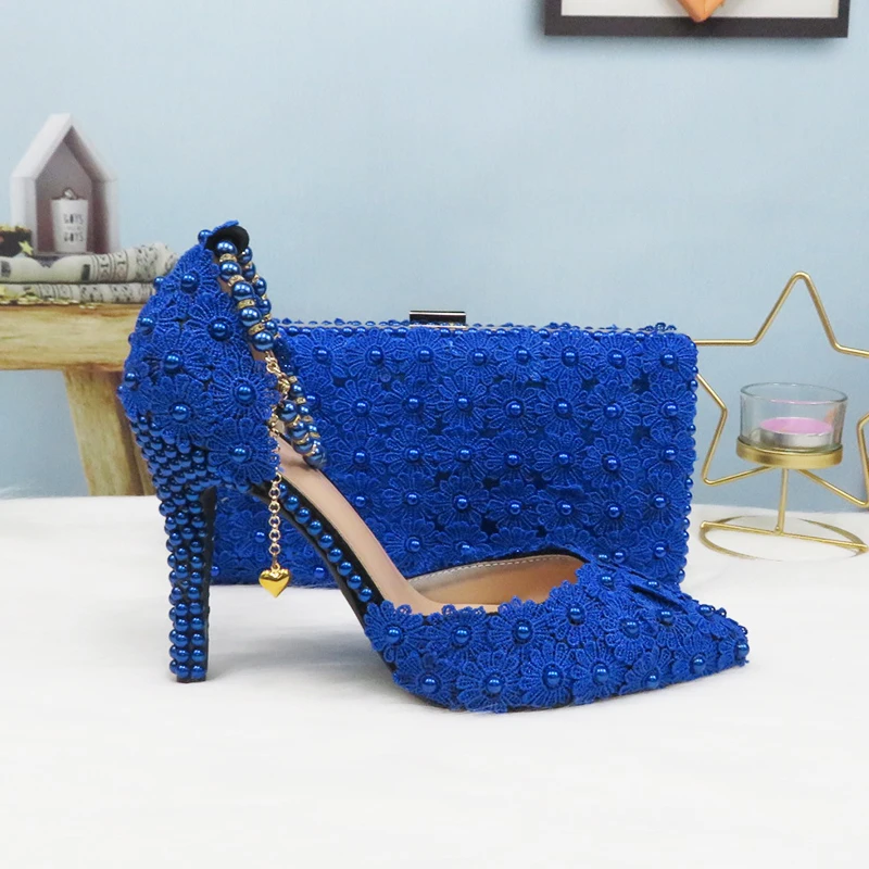 Белые свадебные туфли с кружевными цветами и сумочкой в комплекте; Женские вечерние туфли на высоком каблуке с острым носком и ремешком на щиколотке; Модель комплект из обуви и сумки года; Королевский синий цвет