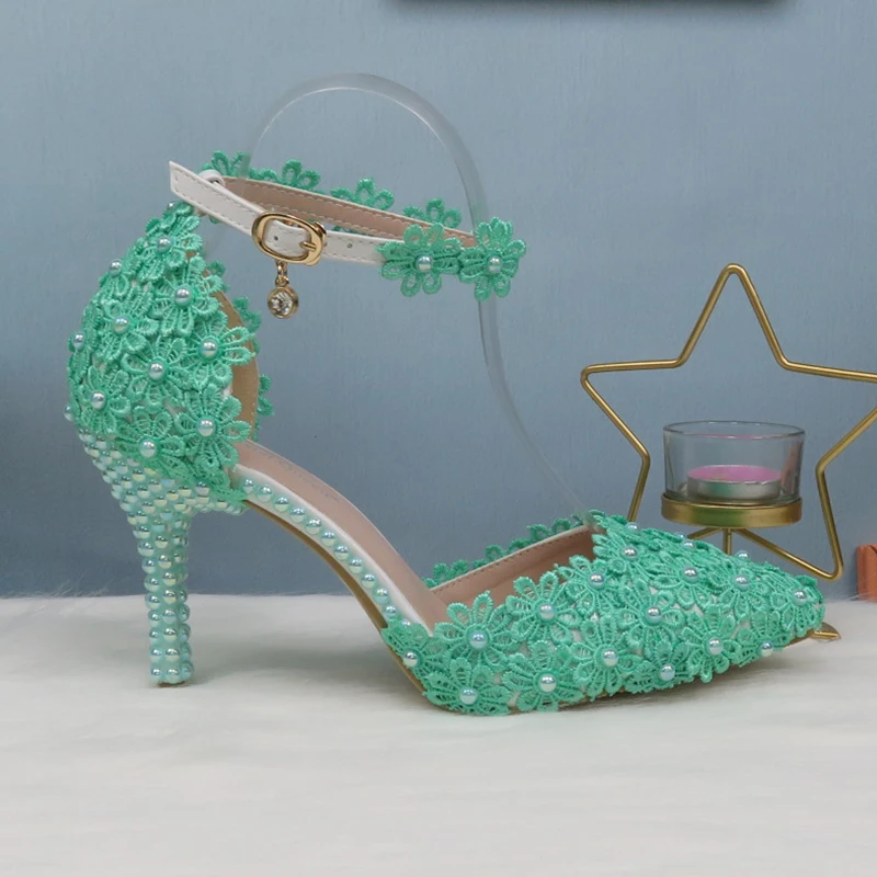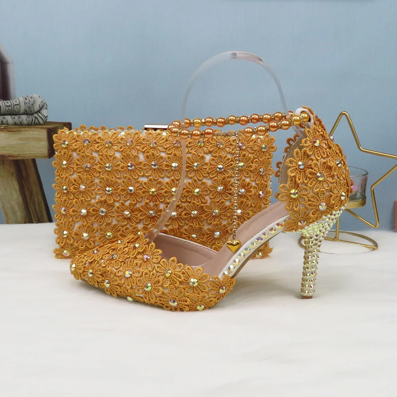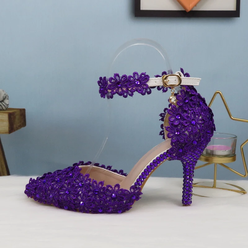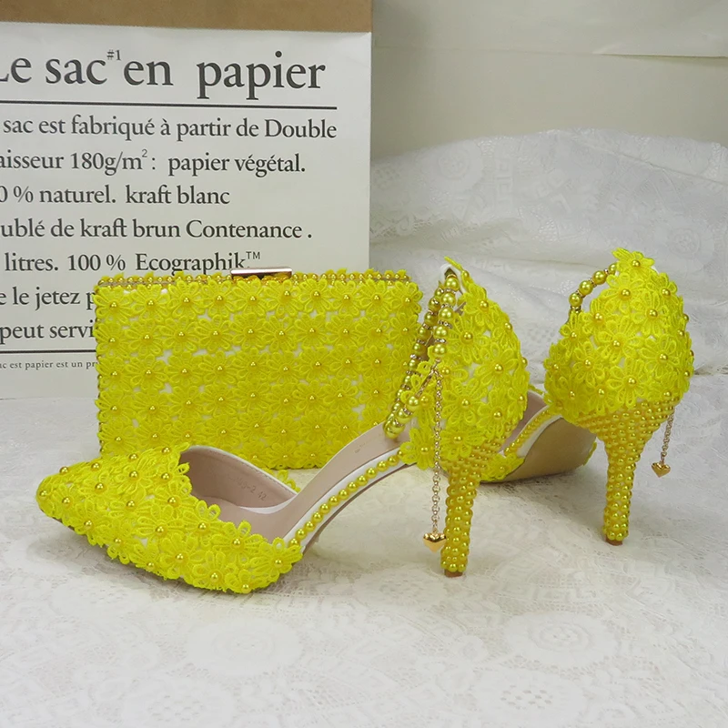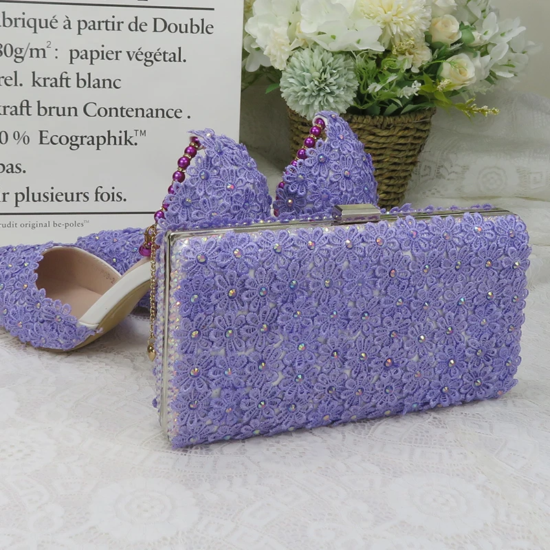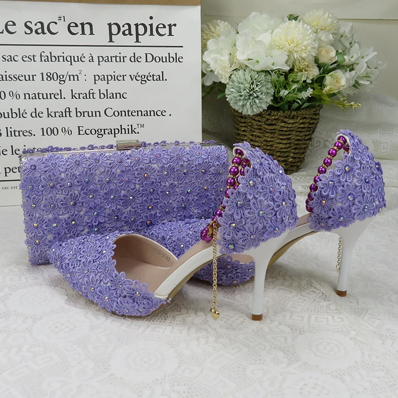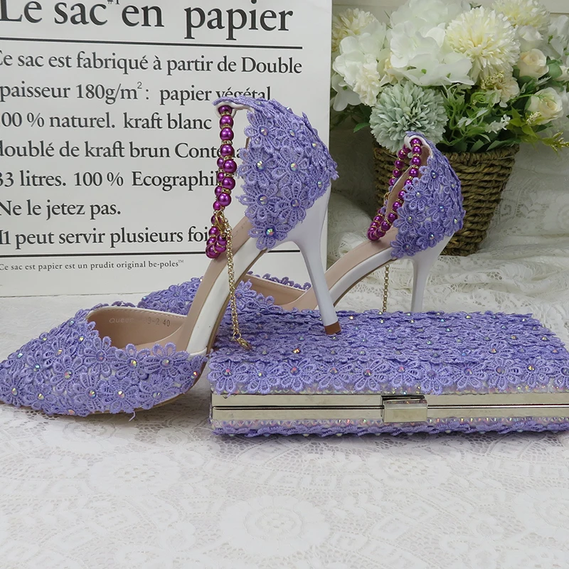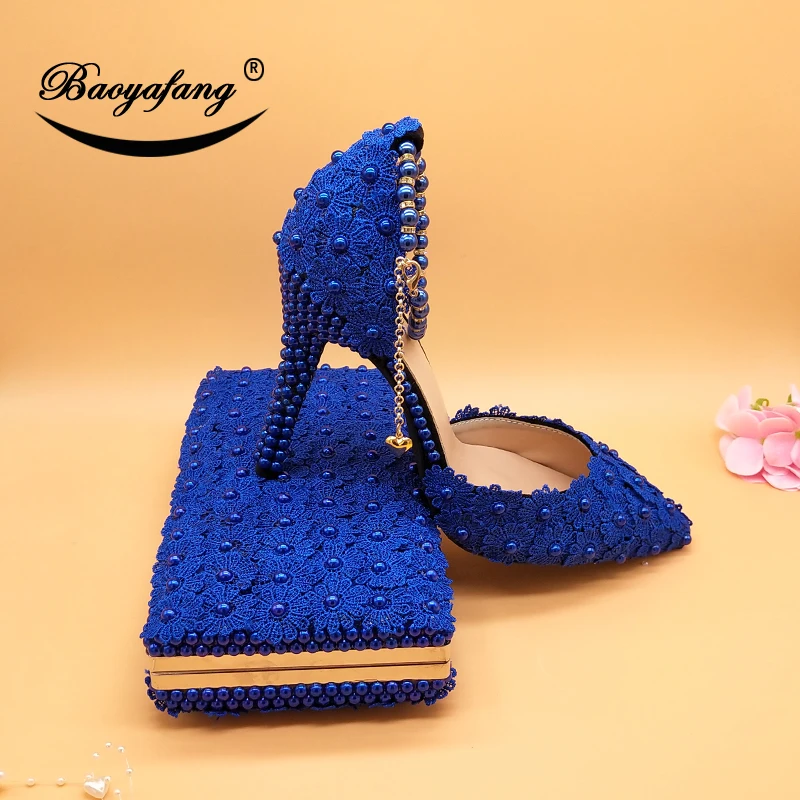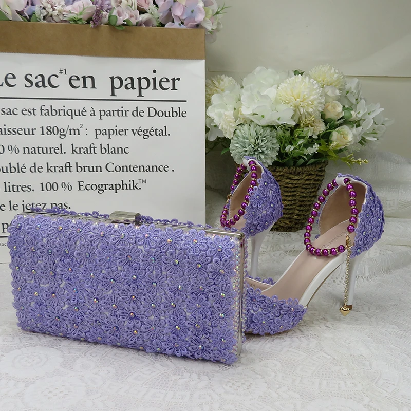 Белые свадебные туфли с кружевными цветами и сумочкой в комплекте; Женские вечерние туфли на высоком каблуке с острым носком и ремешком на щиколотке; Модель комплект из обуви и сумки года; Королевский синий цвет