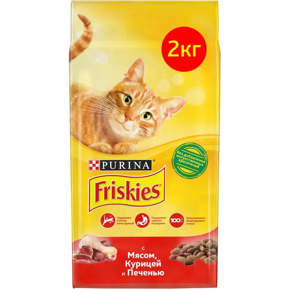 Сухой корм Friskies для взрослых кошек, с мясом, курицей и печенью, Пакет, 2 кг