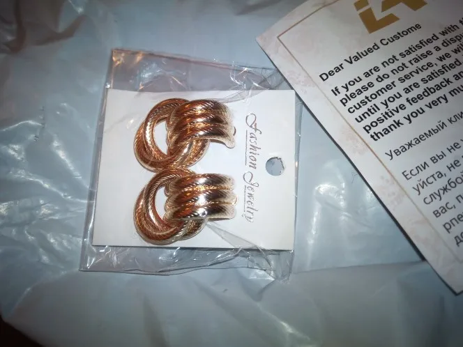 с продавцом не переписывалась написала только раз когда оплатила ,серьги такие по форме и цвету что и на фото выписала под золото не тяжёлые 3 на 4 см они все металические.товар пришёл в россию саратовскую обл за 3 недели в принципе не долго ,заказывайте не пожалеете