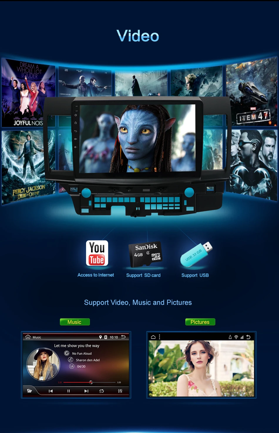10 дюймов Android 10,0 + емкостный Экран + 1024*600 + 4 ядра 1,2 ГГц Процессор + DDR3 2 ГБ флэш-памяти + 32 ГБ памятиT3 Cortex A7,GPU:Mali400Выходная мощность: 4*45 ВтBluetooth 5,0, радио IC 7786. Усилитель 7388Рабочая температура-20 ℃-+ 70 ℃Видео: поддержка 1080P,AUX IN, RCA выход