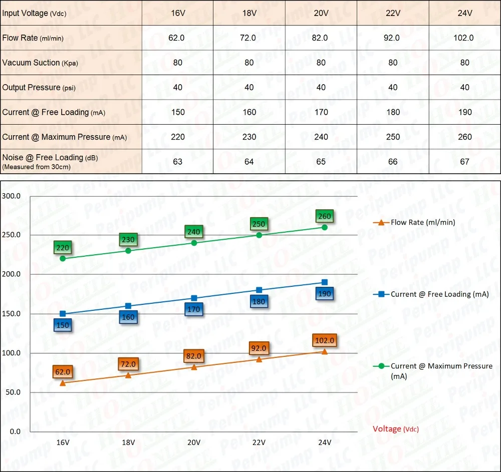 Точный расход 100 мл +/- 8% в минуту @ 24Vdc, 0Cps